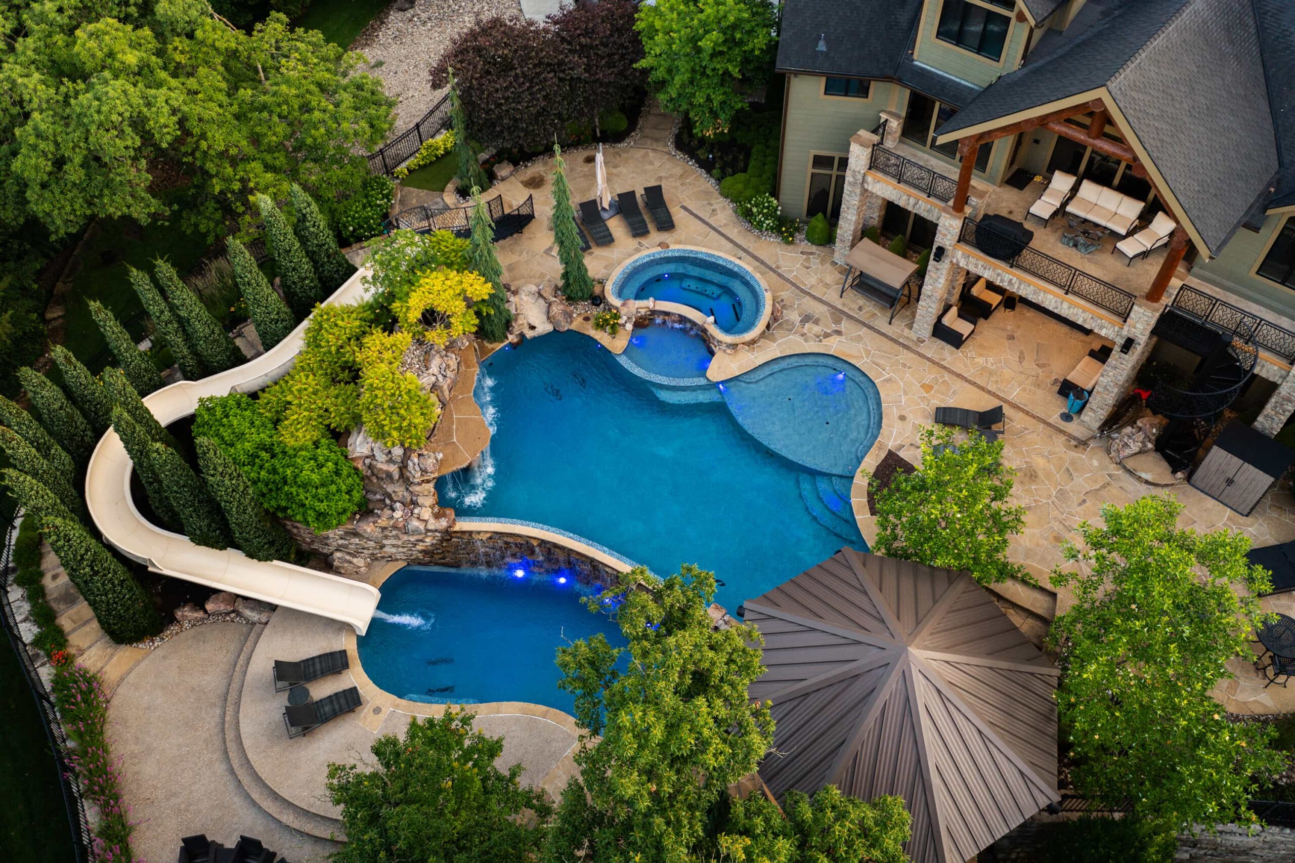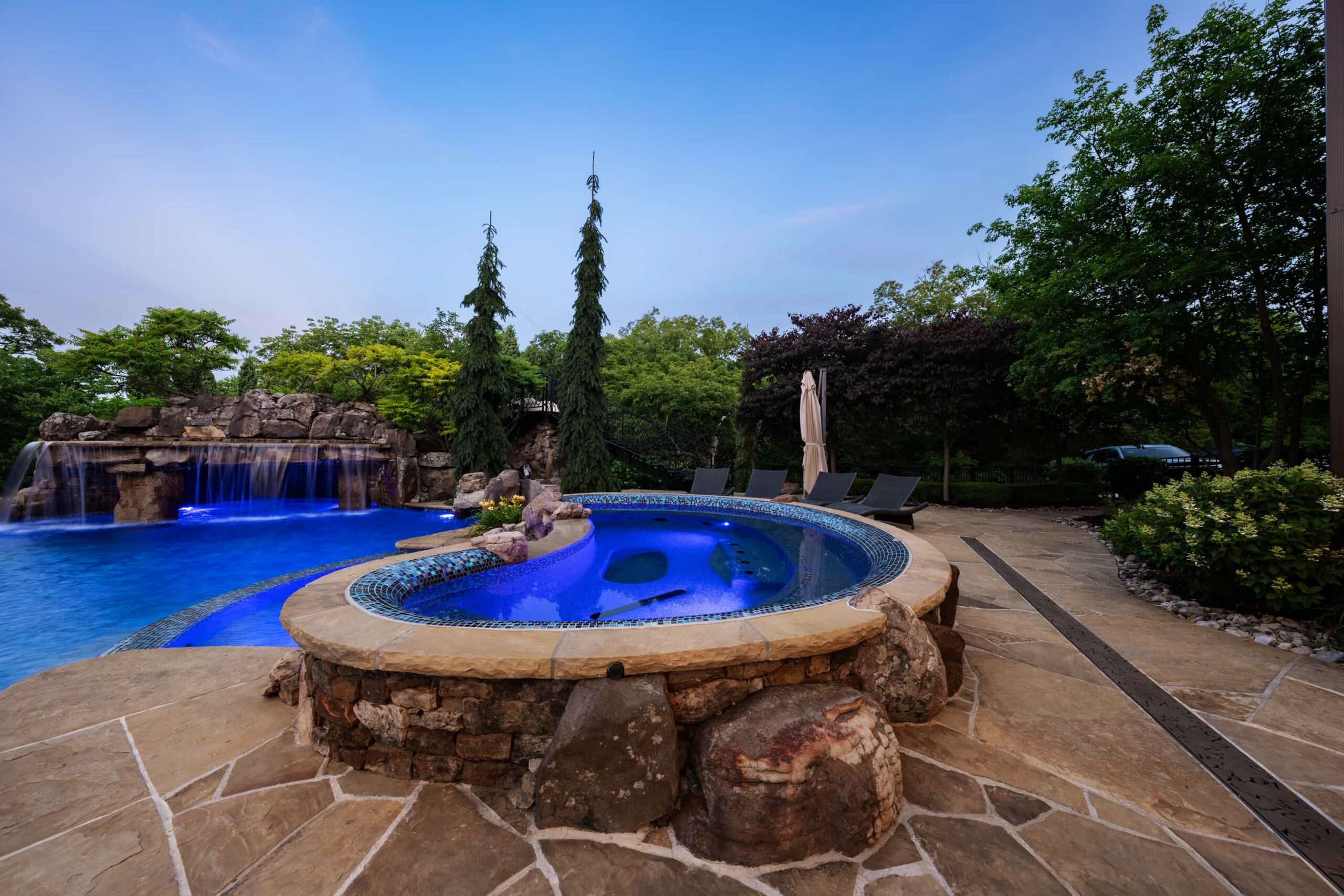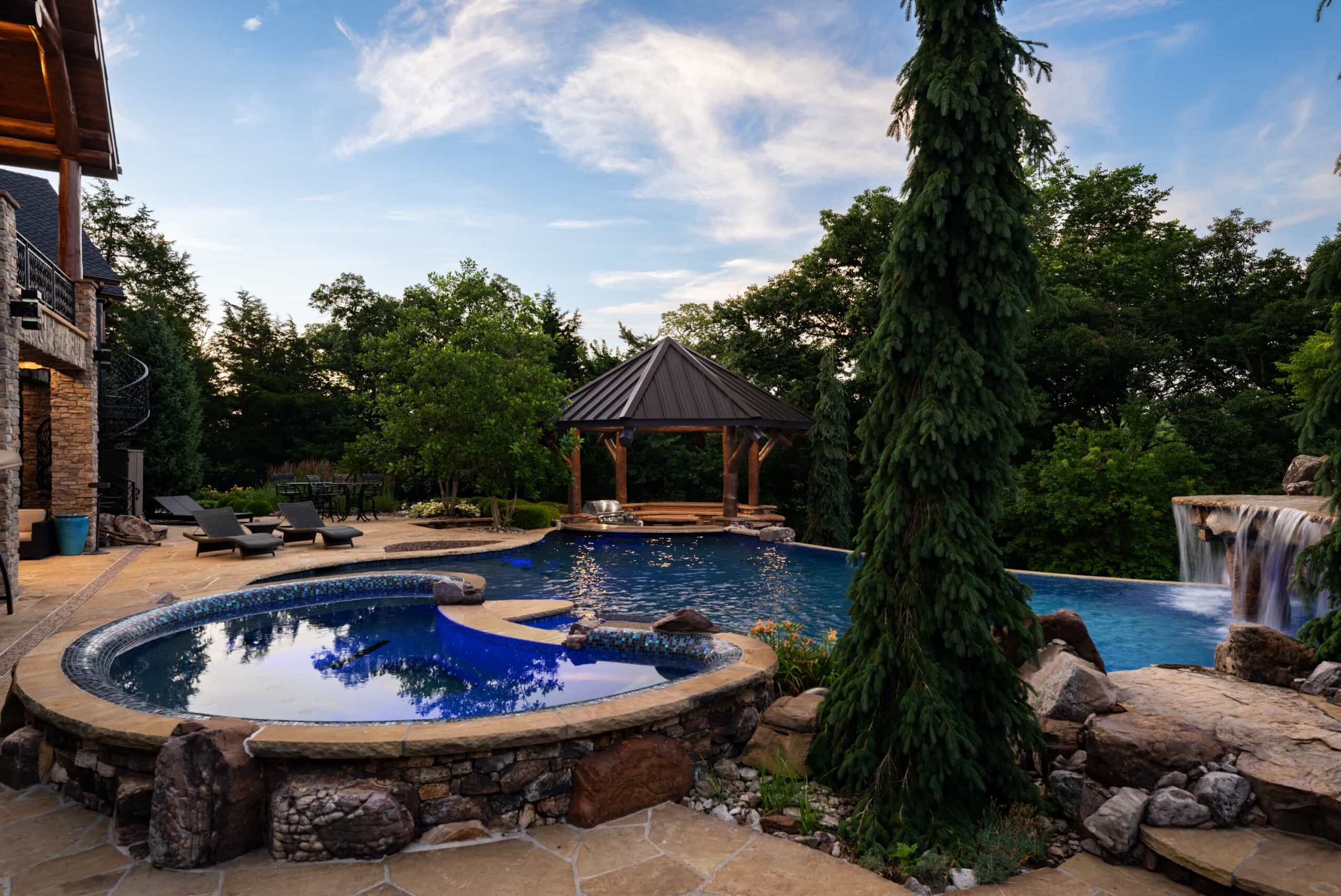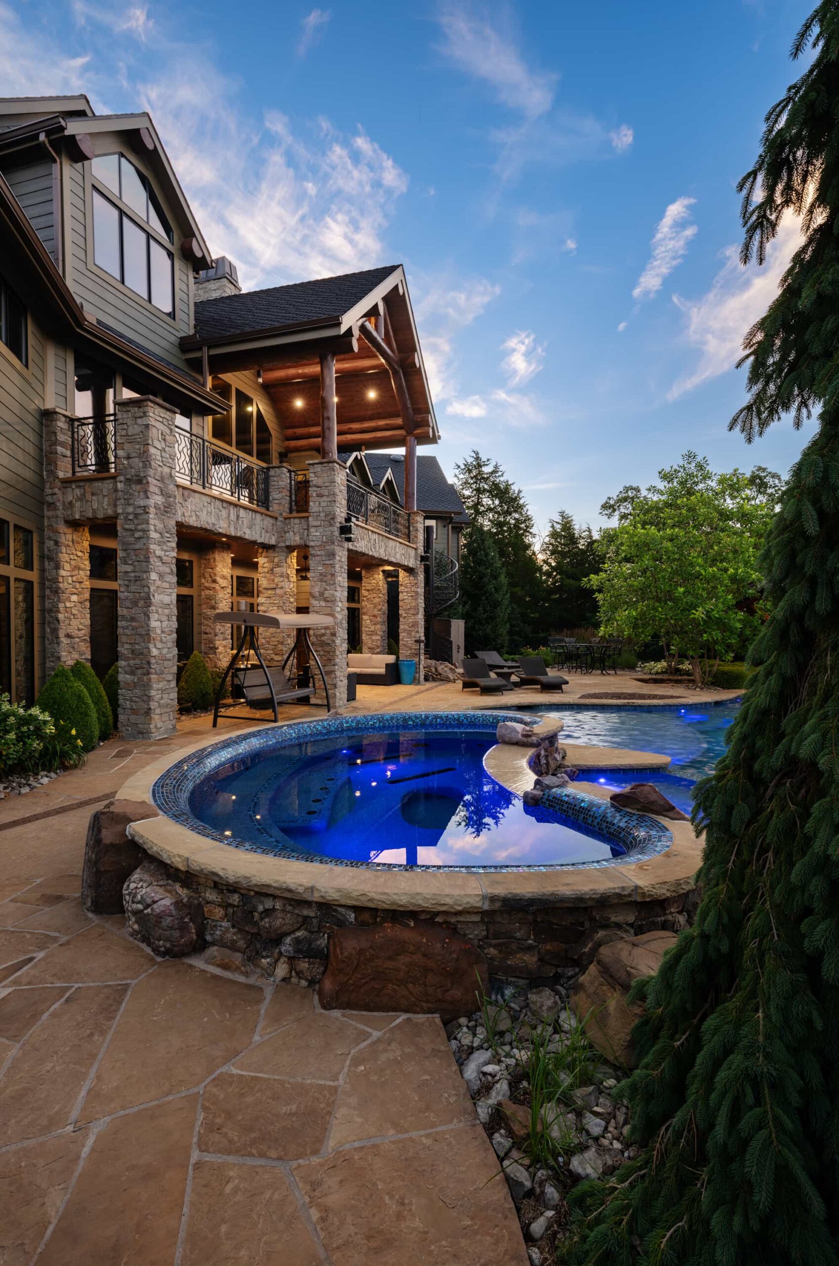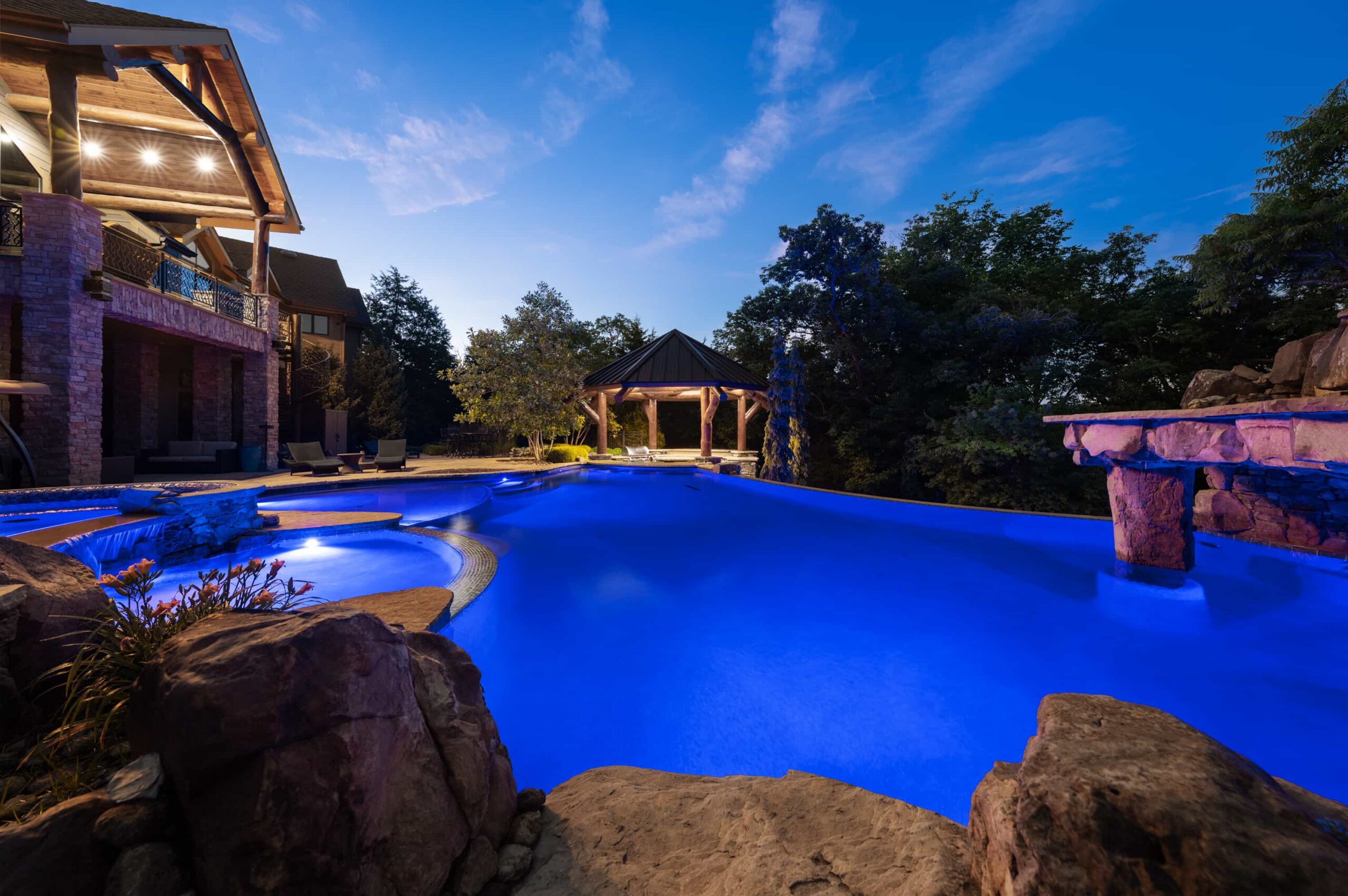 As evening falls, underwater lighting, fire features, and landscape illumination bring dimension and depth to every surface. The result is a sophisticated, multi-sensory outdoor living experience — designed for hosting, relaxing, and enjoying every season in style.