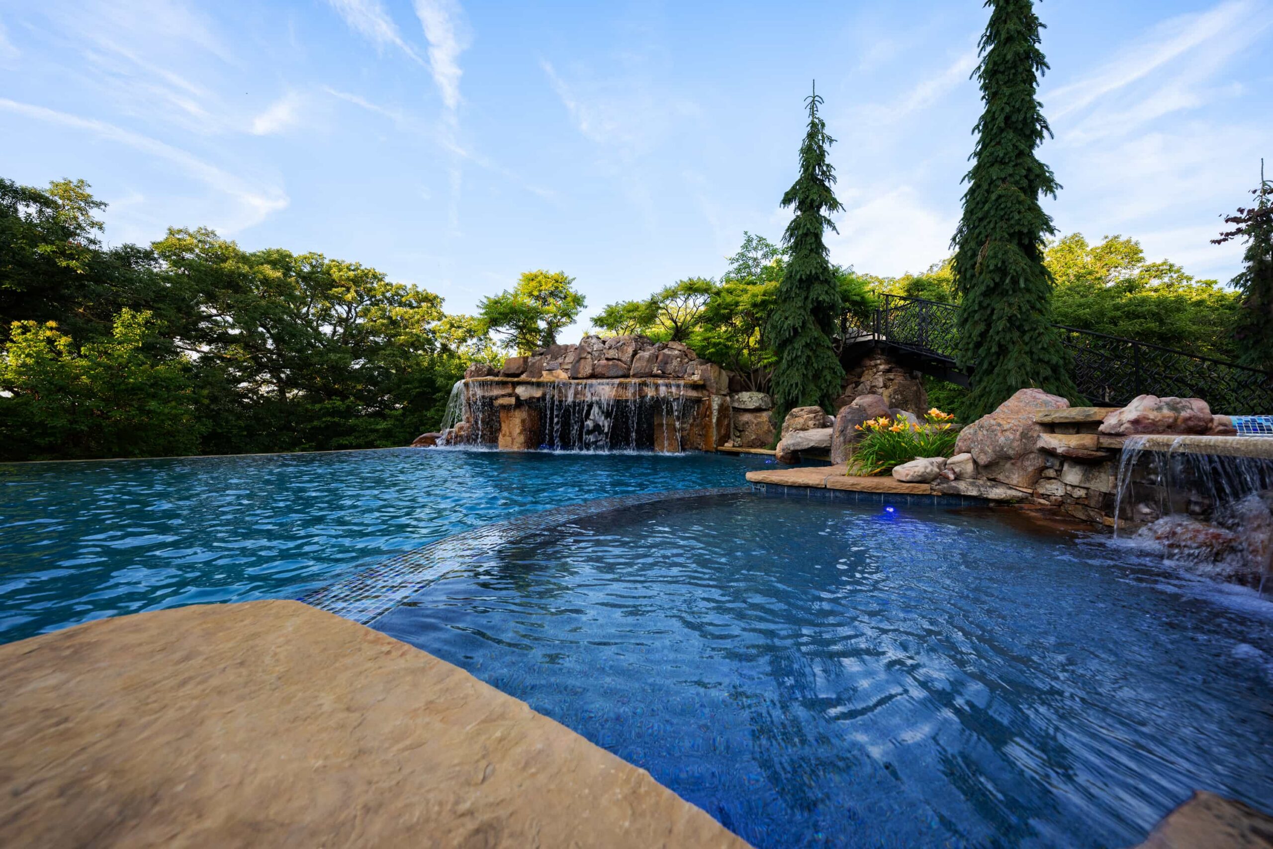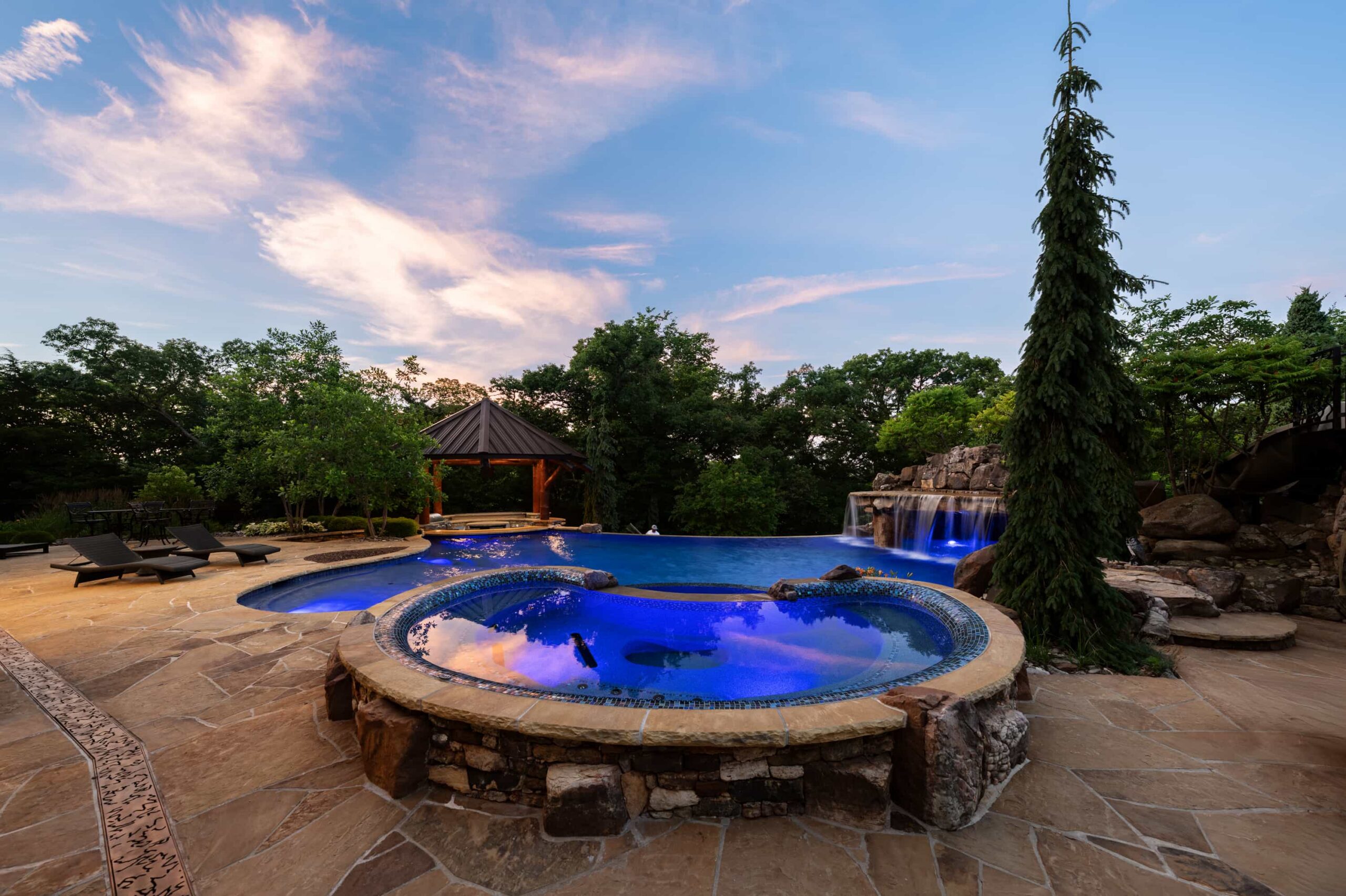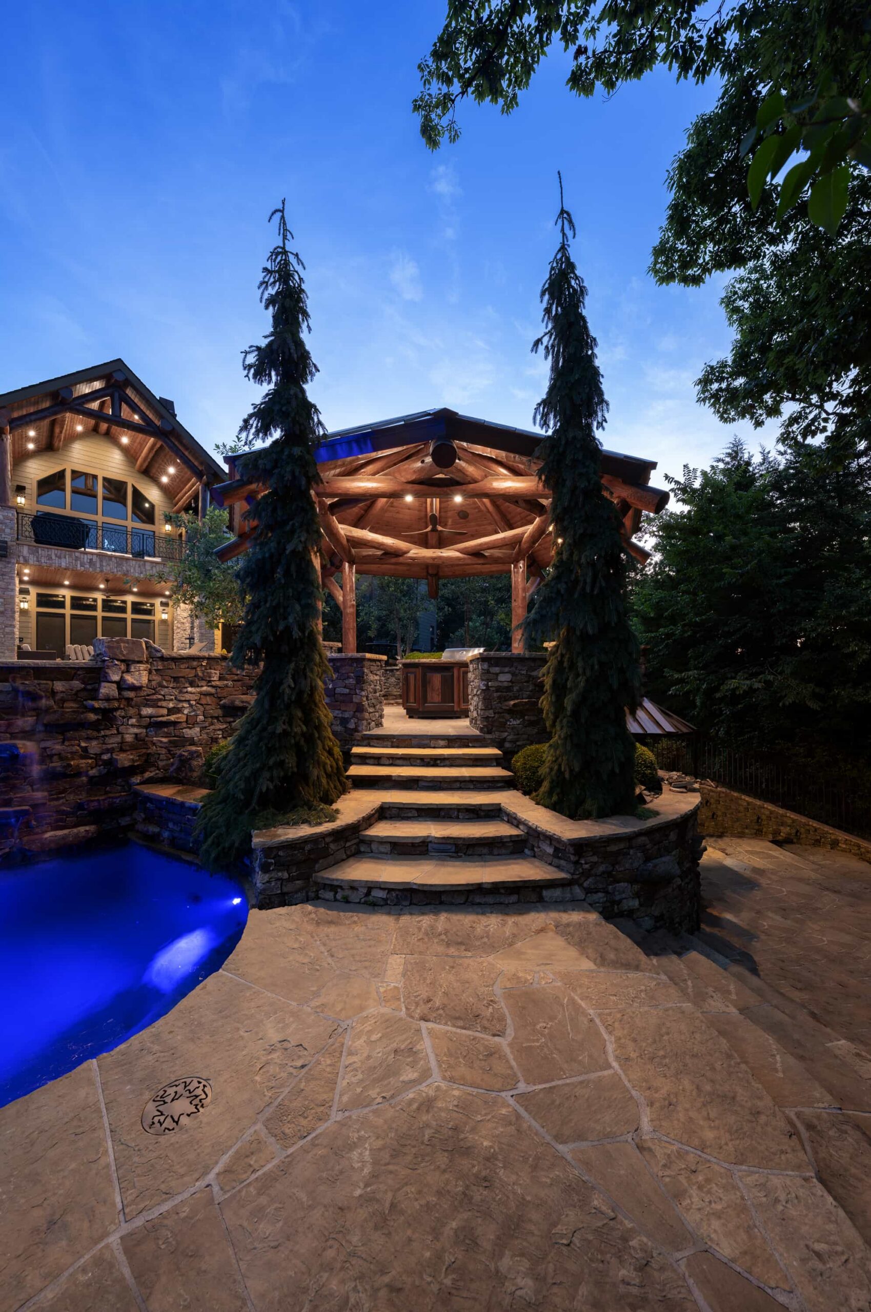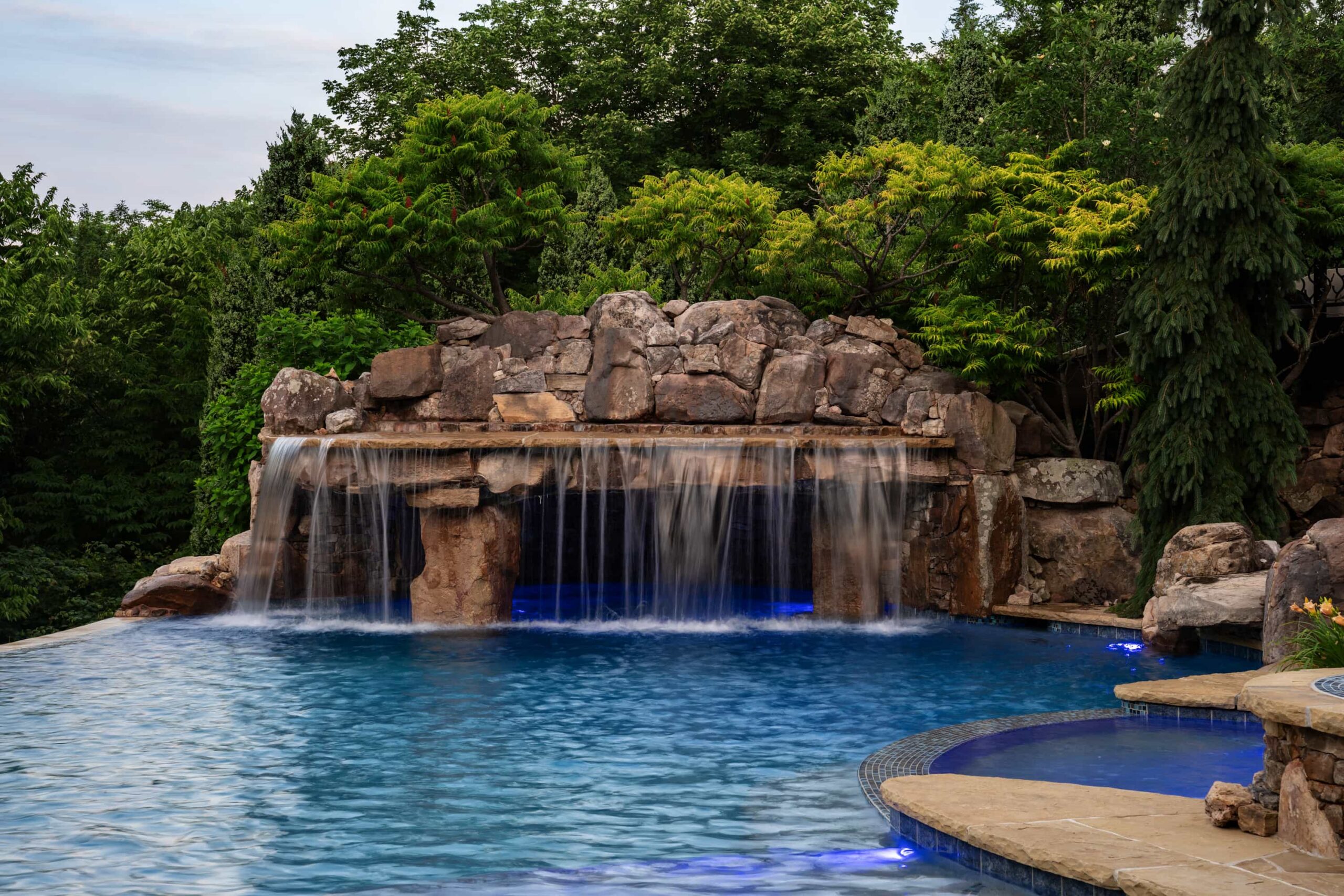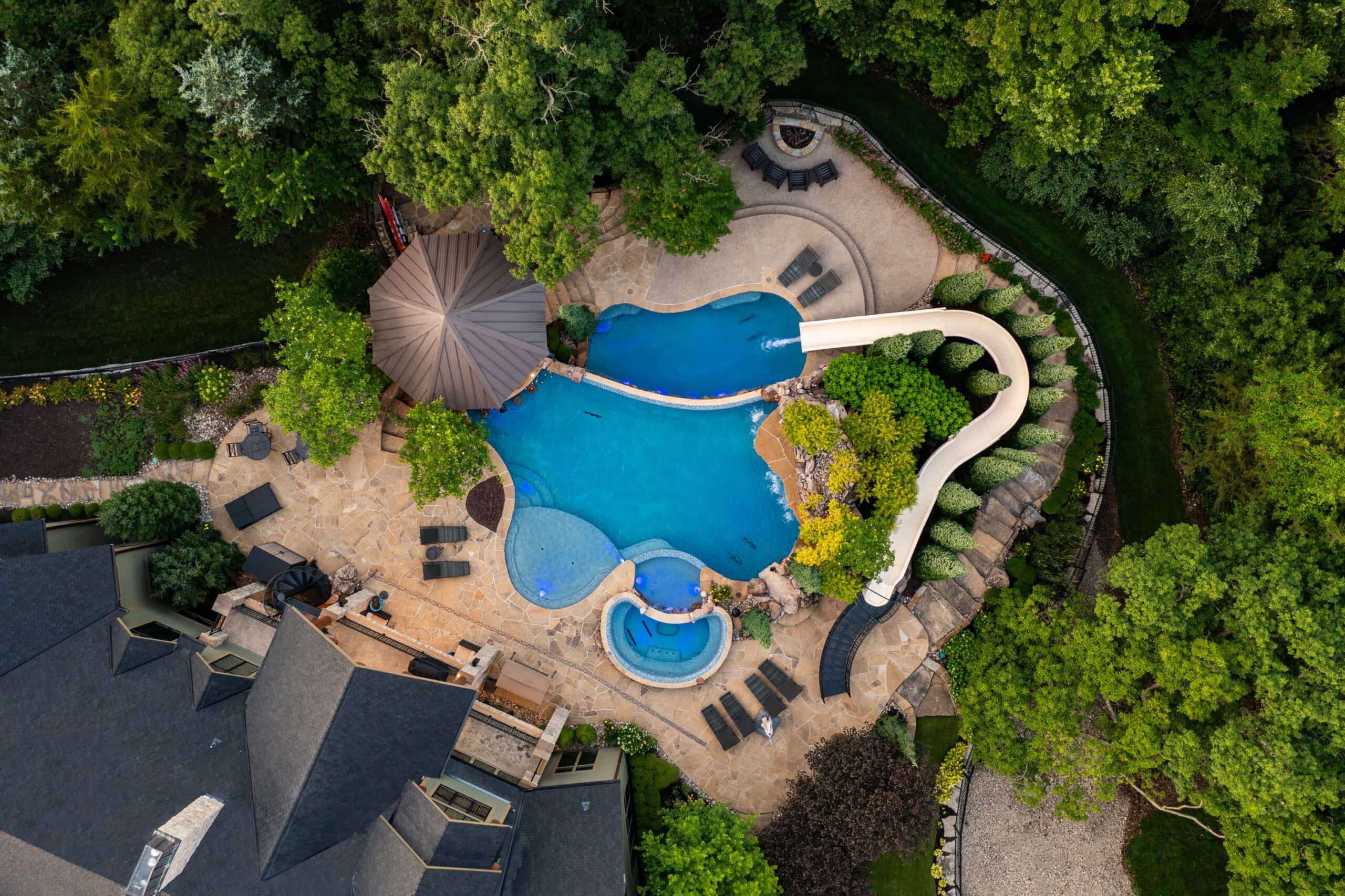 As evening falls, underwater lighting, fire features, and landscape illumination bring dimension and depth to every surface. The result is a sophisticated, multi-sensory outdoor living experience — designed for hosting, relaxing, and enjoying every season in style.