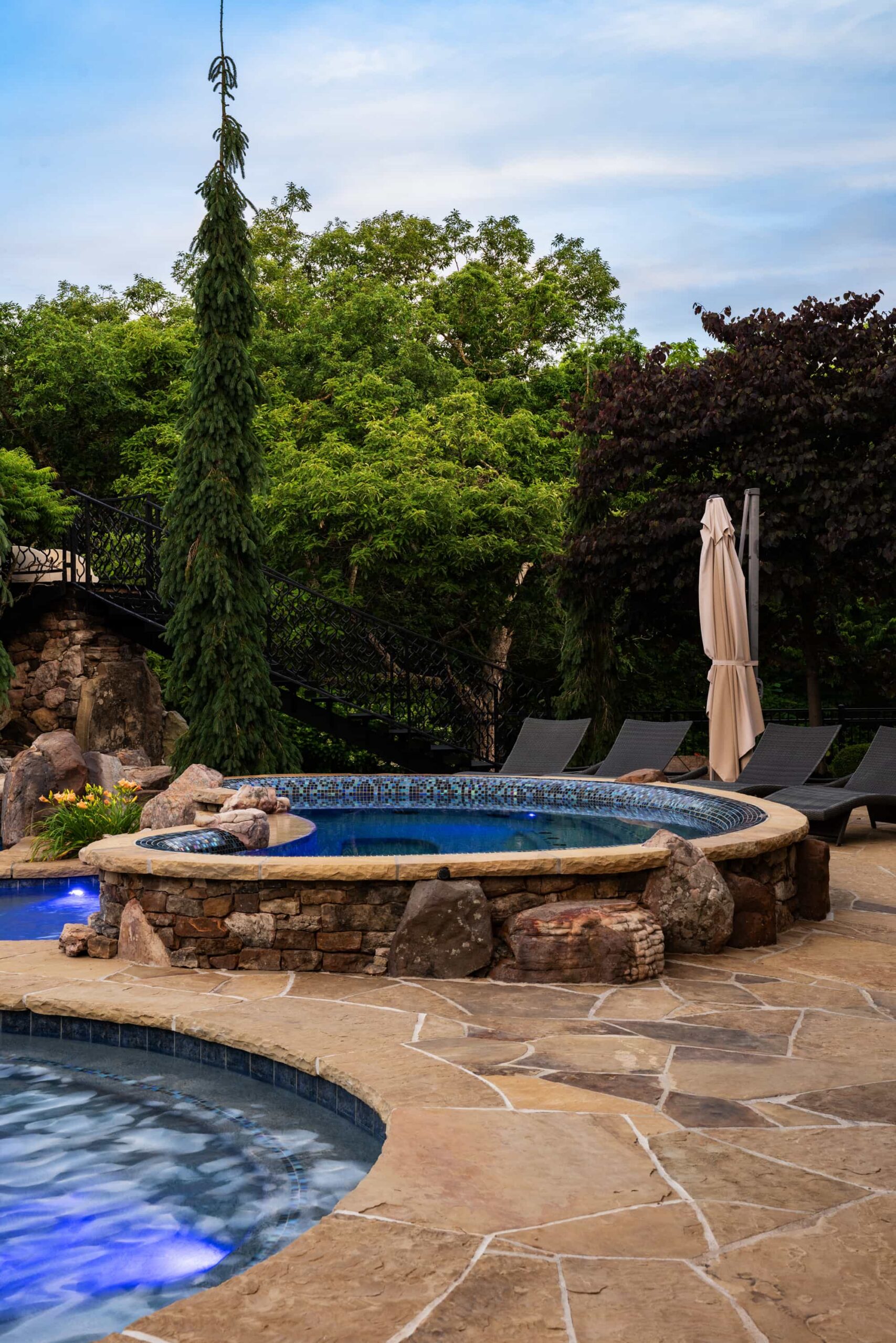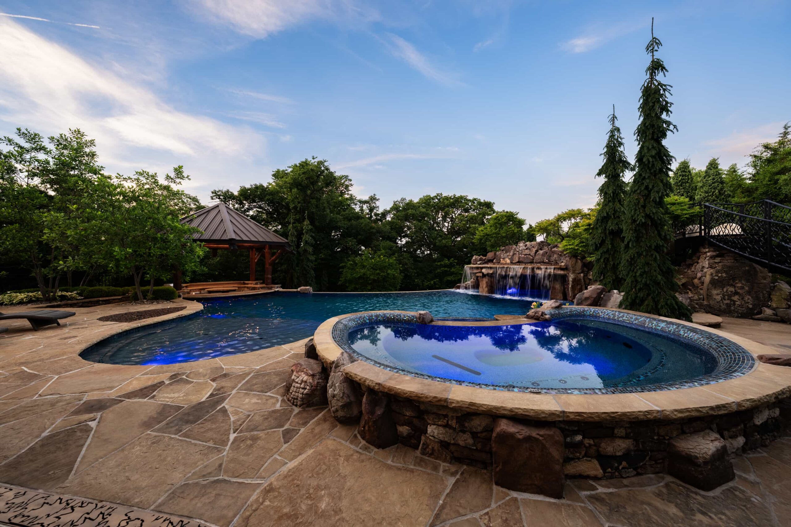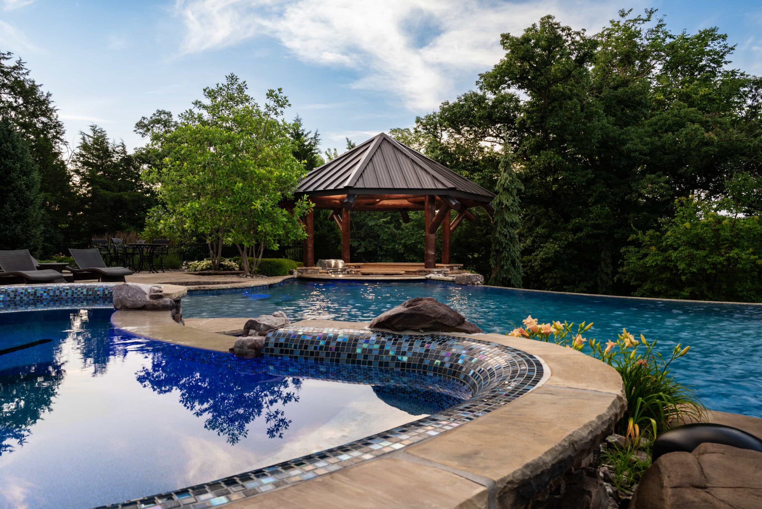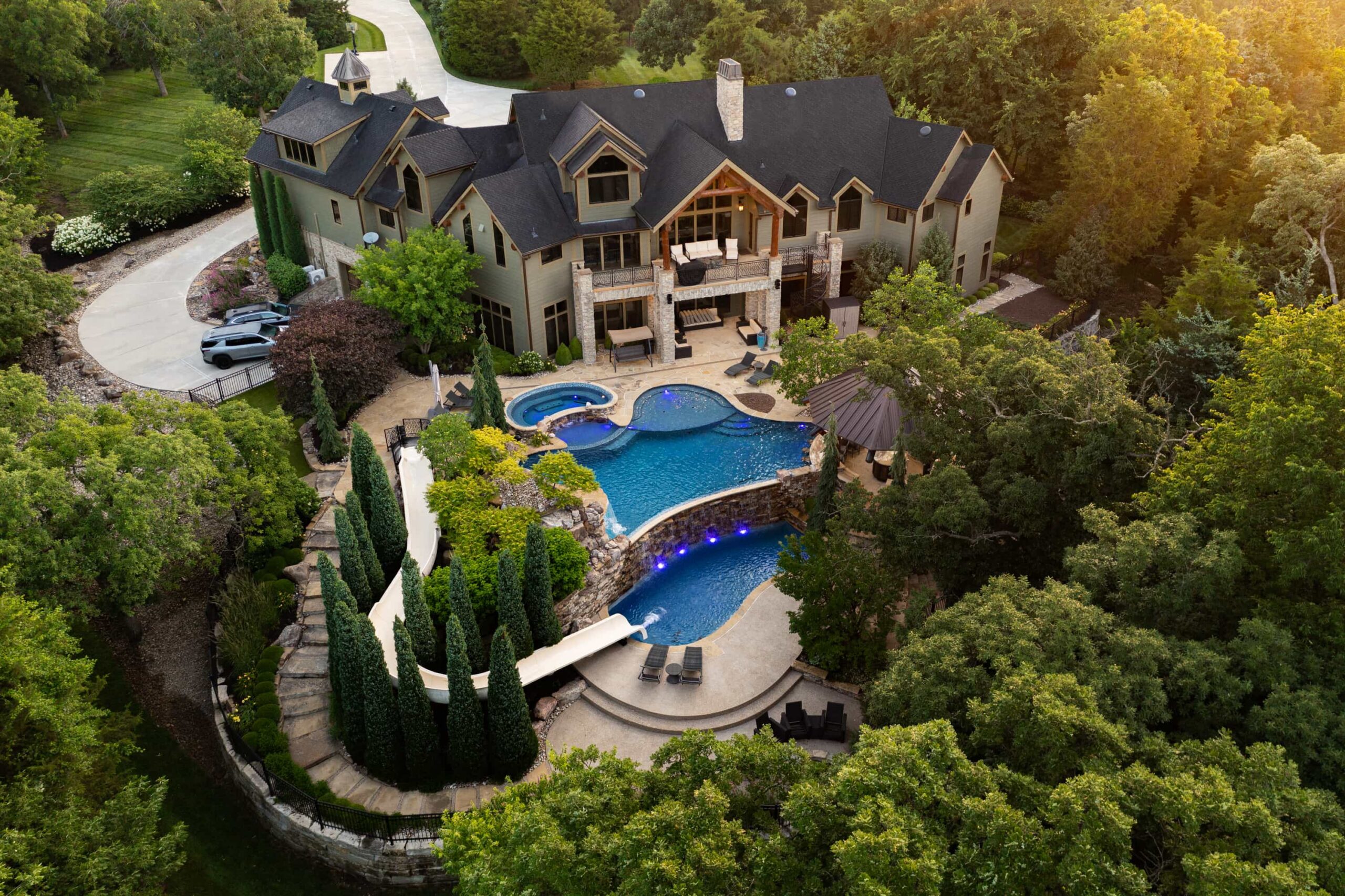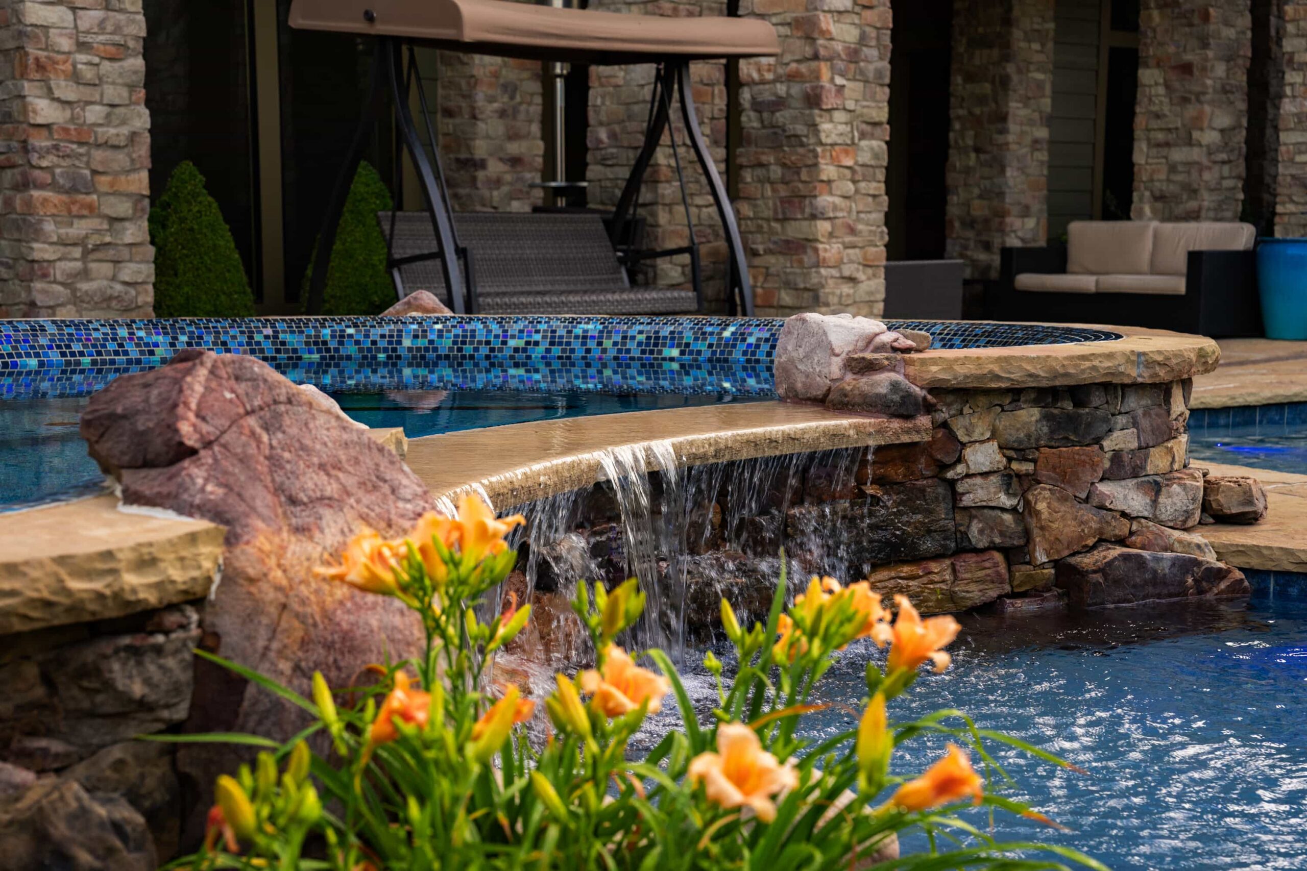 As evening falls, underwater lighting, fire features, and landscape illumination bring dimension and depth to every surface. The result is a sophisticated, multi-sensory outdoor living experience — designed for hosting, relaxing, and enjoying every season in style.