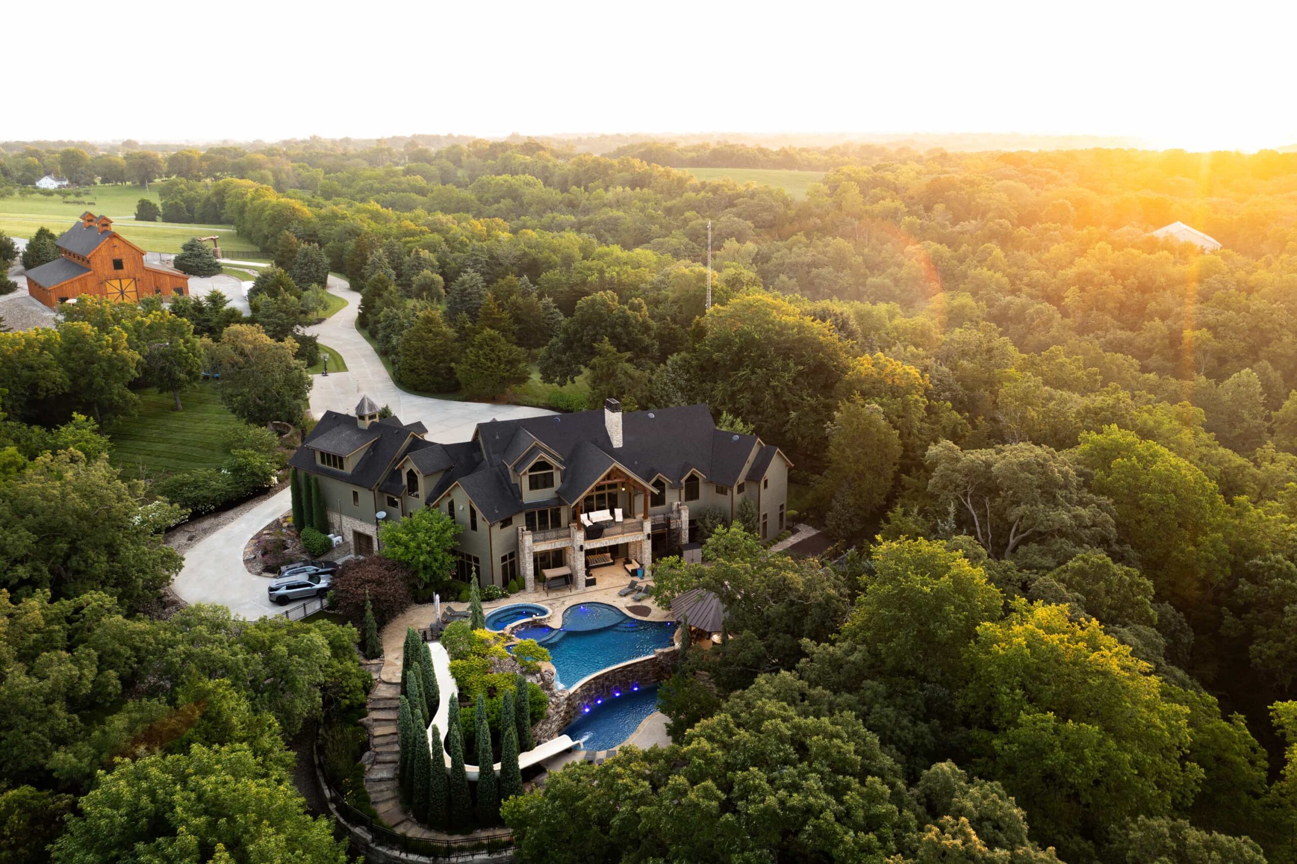The freeform pool design weaves seamlessly through the expansive limestone terrace, connecting multiple zones of activity. An integrated circular spa offers a secluded place to unwind, while a sun shelf and sculptural in-water loungers provide resort-inspired comfort. A swim-up fire lounge set within the pool’s edge creates an unforgettable focal point — allowing guests to gather around flickering flames while partially immersed.