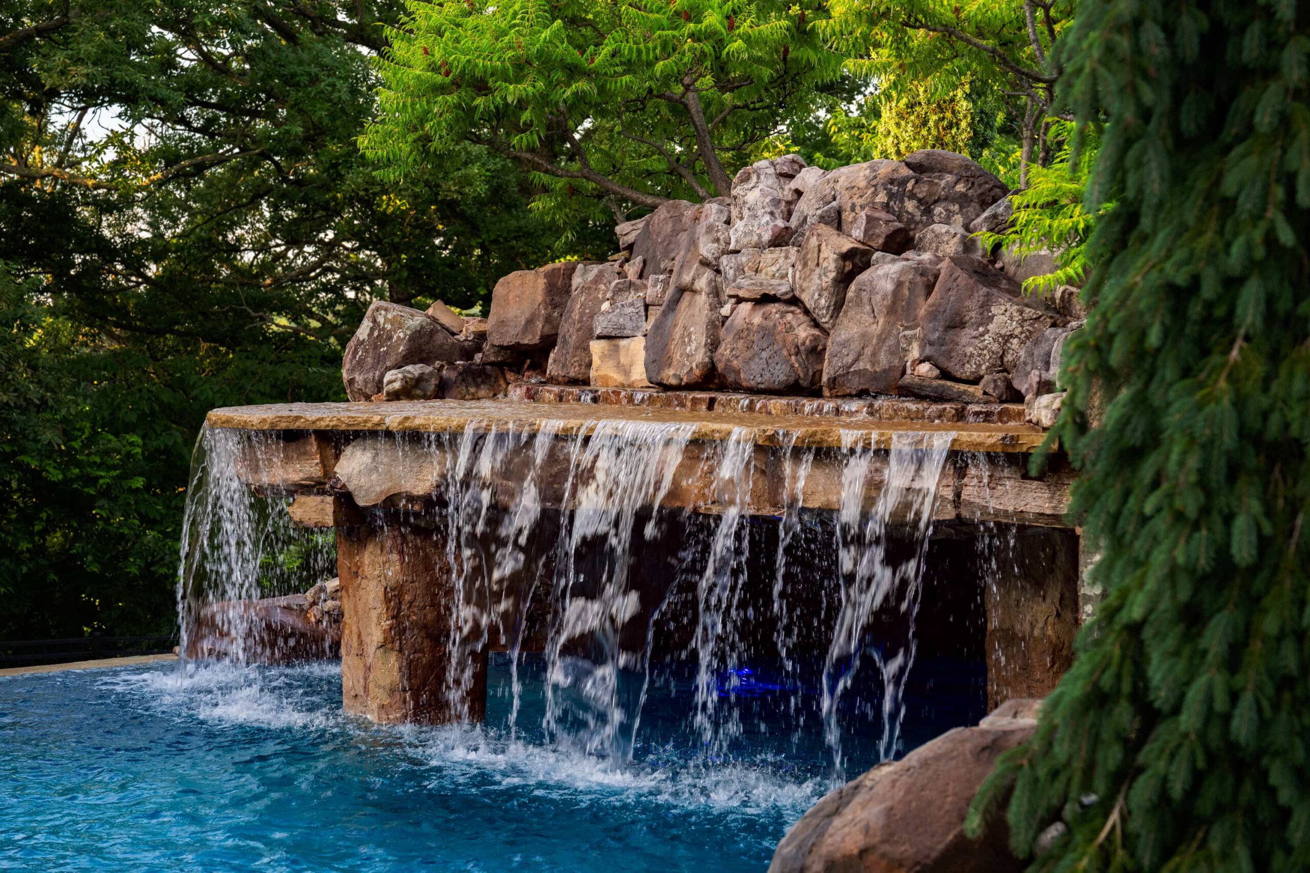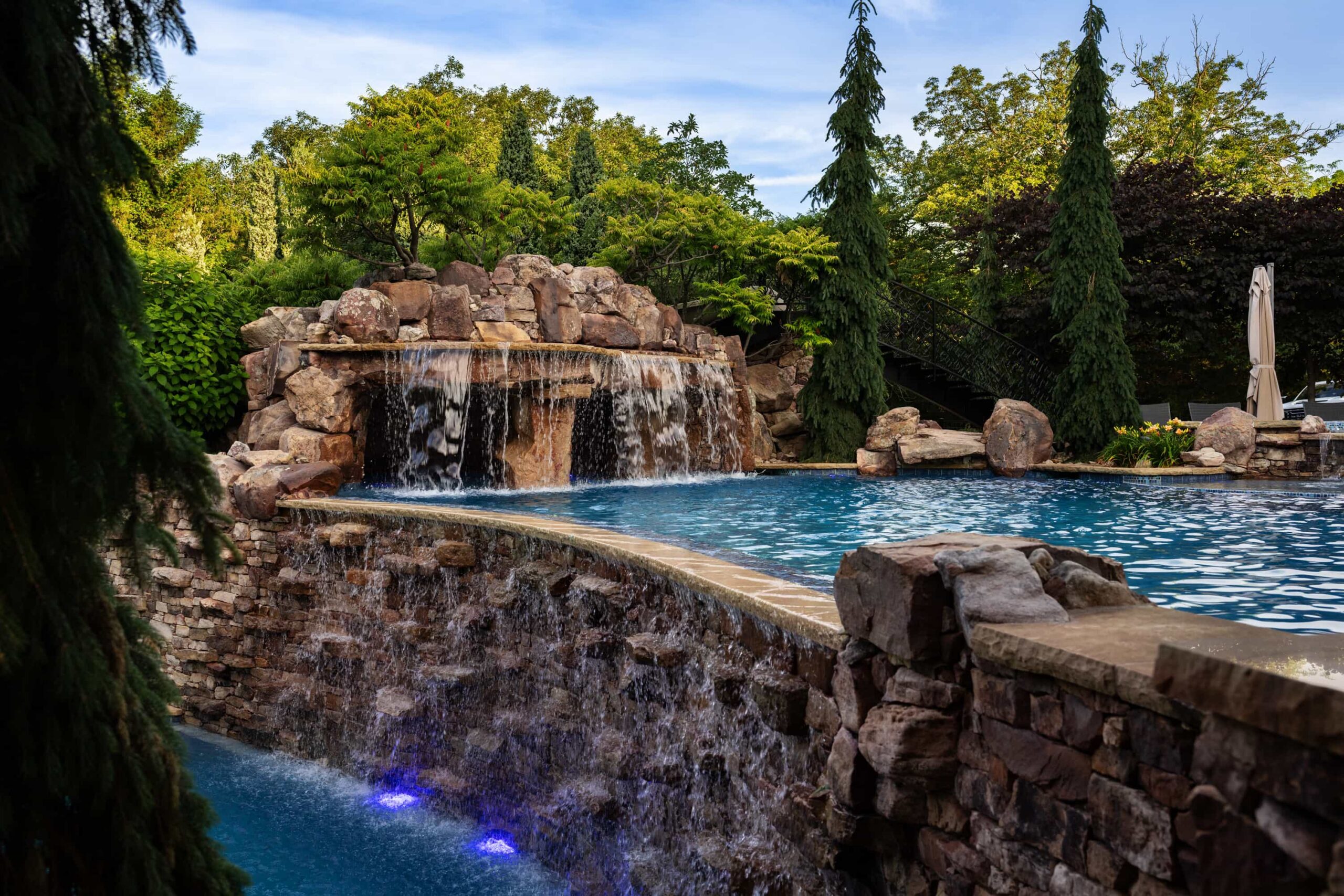 At the center of the space, a dramatic rock waterfall and elevated grotto introduce a naturalistic counterpoint to the clean masonry and structured hardscape. Opposite, a custom outdoor media wall rises from stacked stone, transforming the pool into an open-air theater — equally suited for game day gatherings or relaxed summer movie nights.