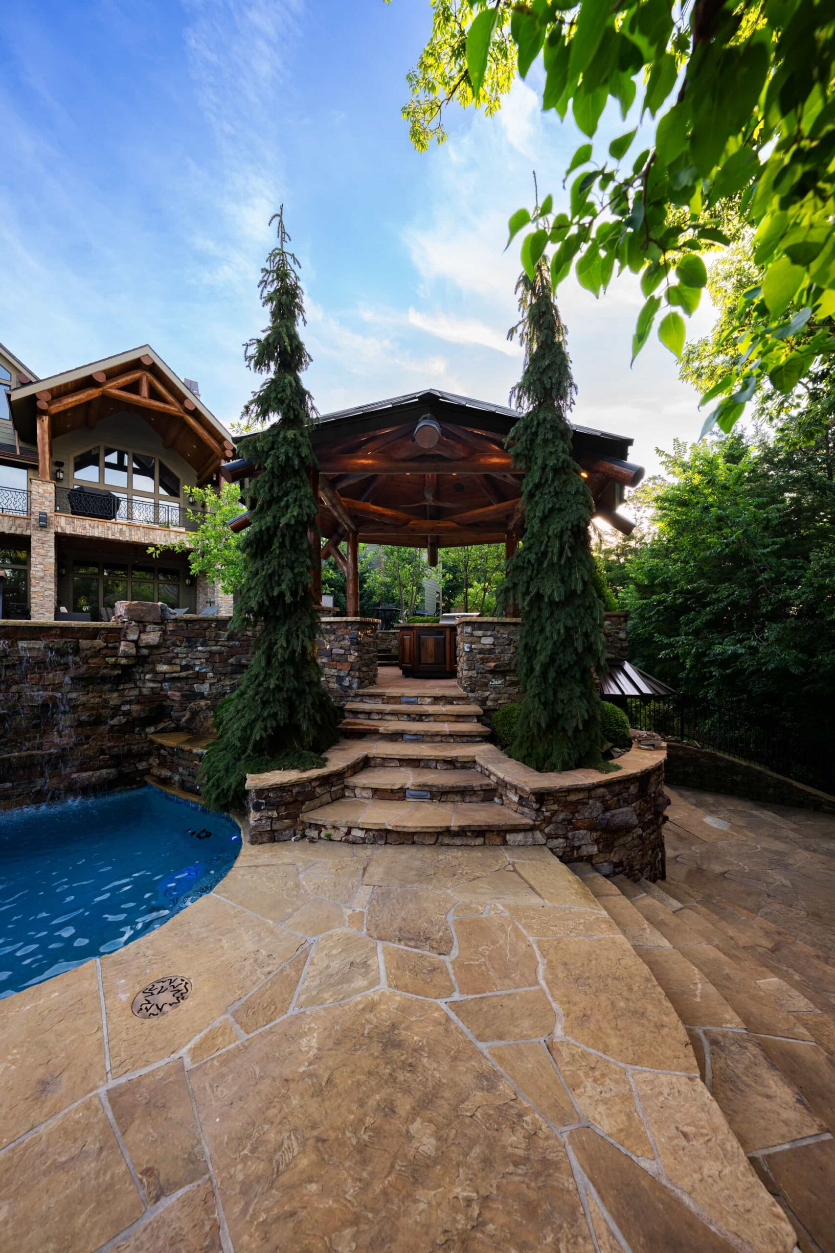 This backyard retreat was designed as a fully immersive entertainment environment — layered with water, fire, texture, and technology. Anchoring the far edge of the pool, a series of symmetrical stone piers feature custom copper scuppers that spill steady ribbons of water into a perimeter basin, creating both visual rhythm and a calming acoustic backdrop.