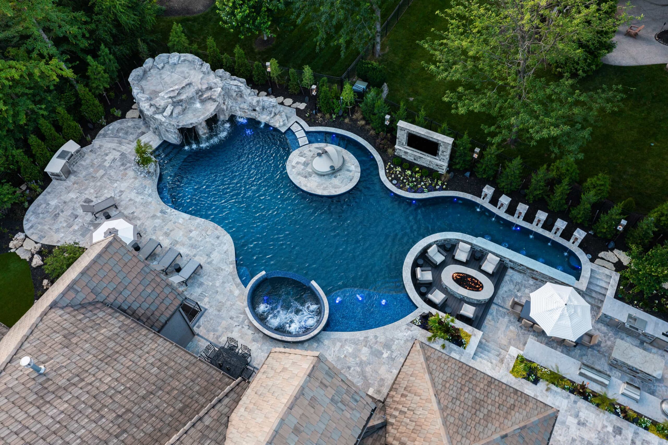 Luxury resort pool with grotto waterfall, spa, and swim-up fire lounge, and custom copper scuppers.
