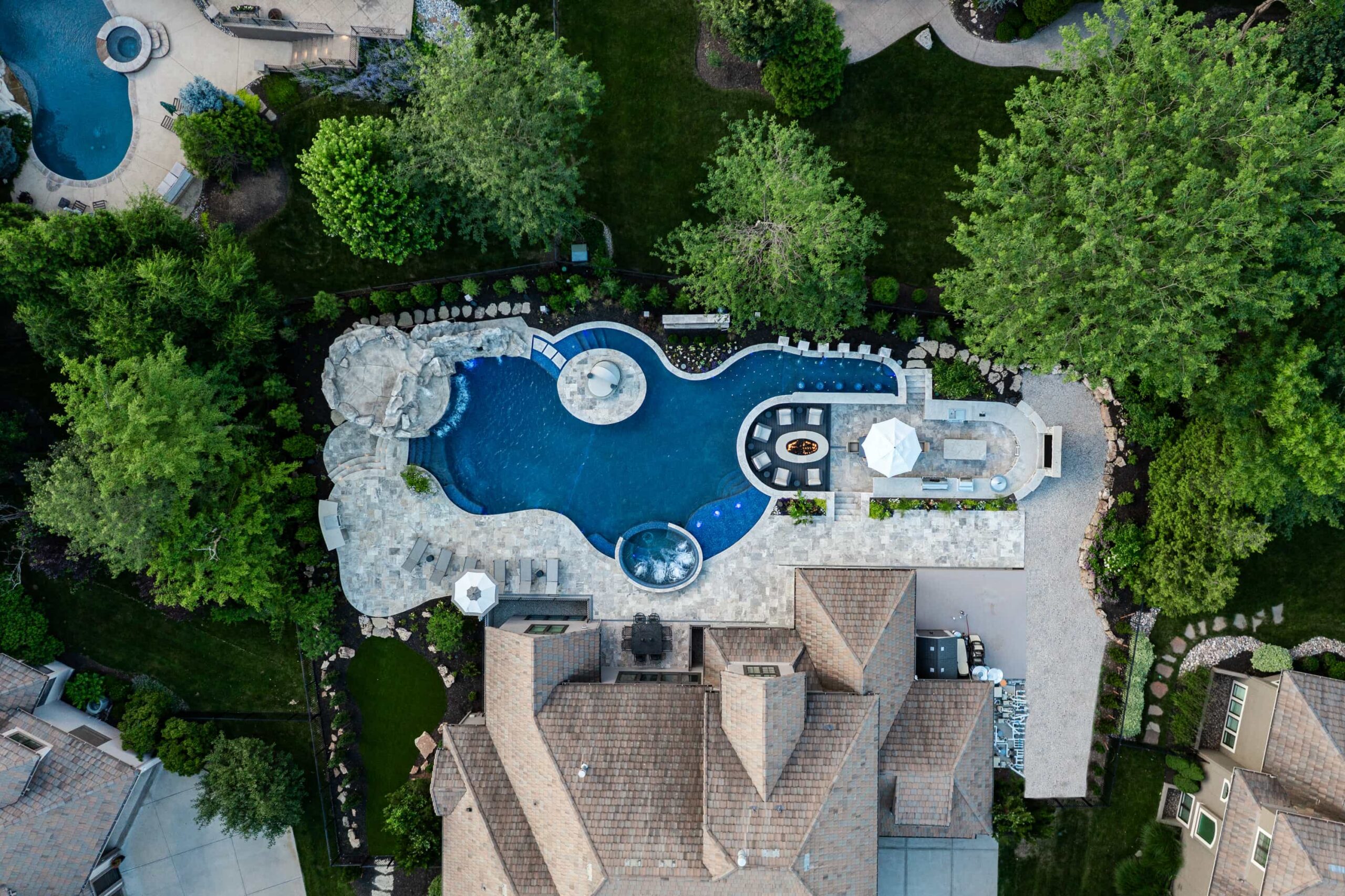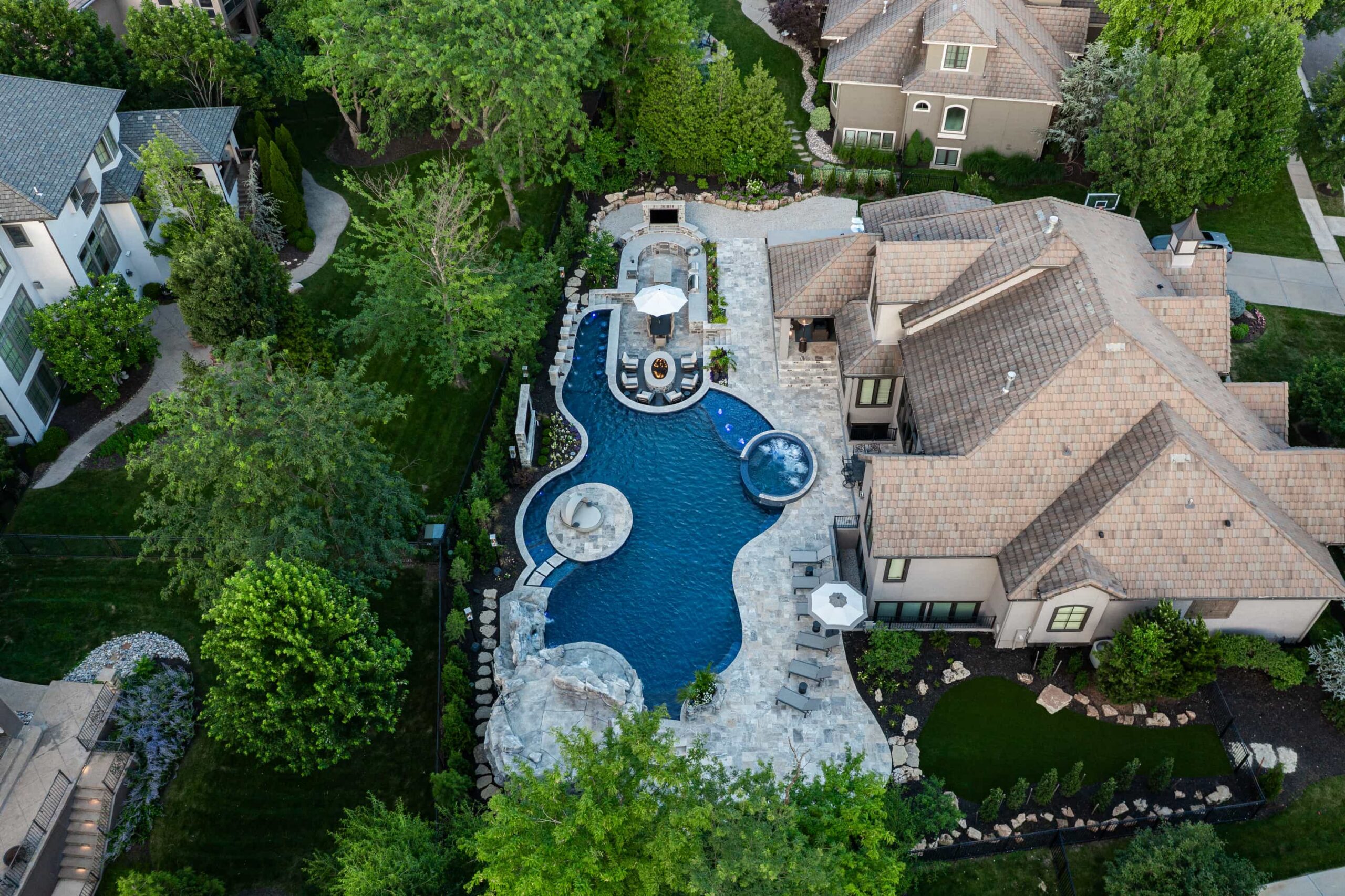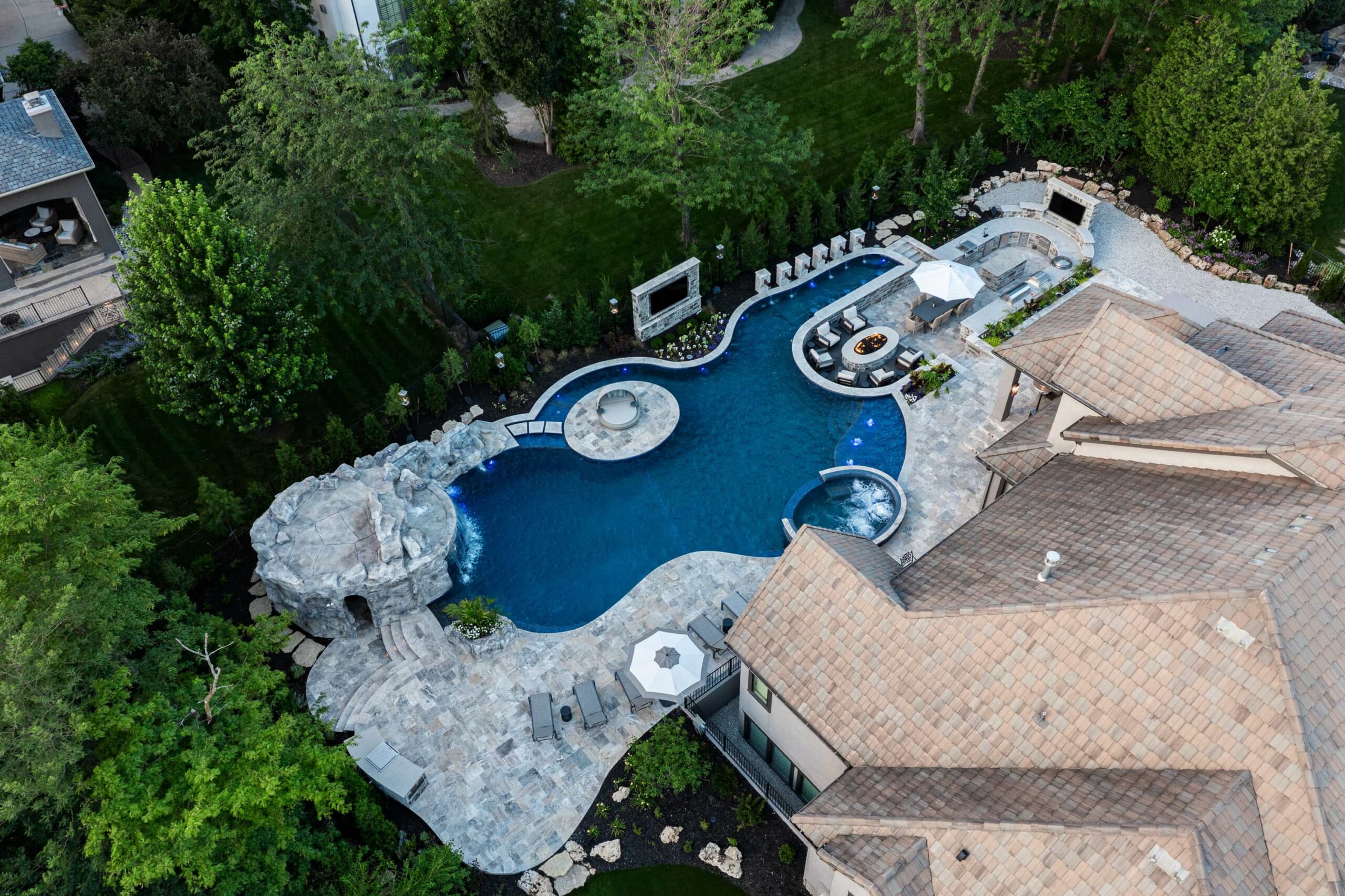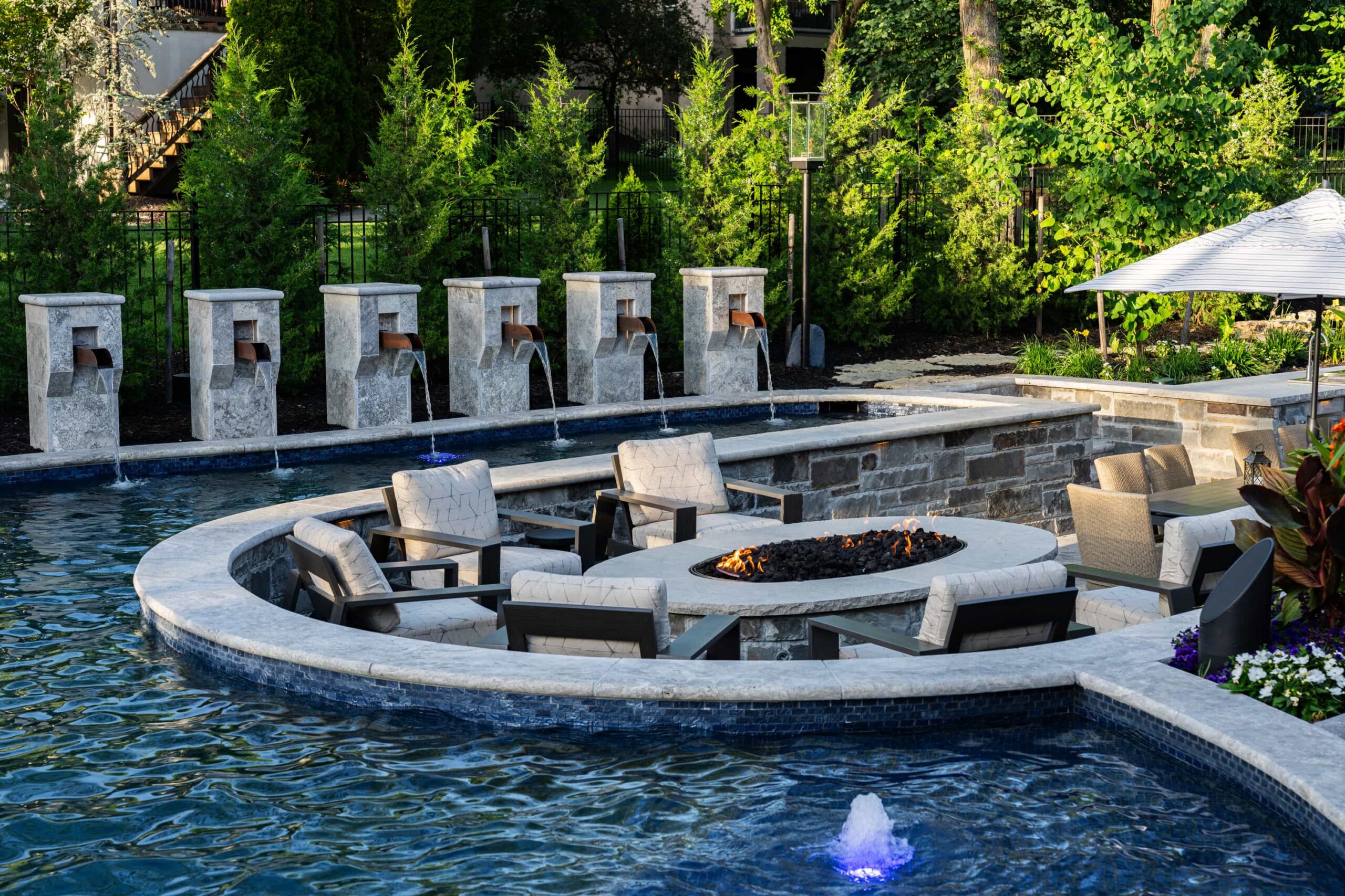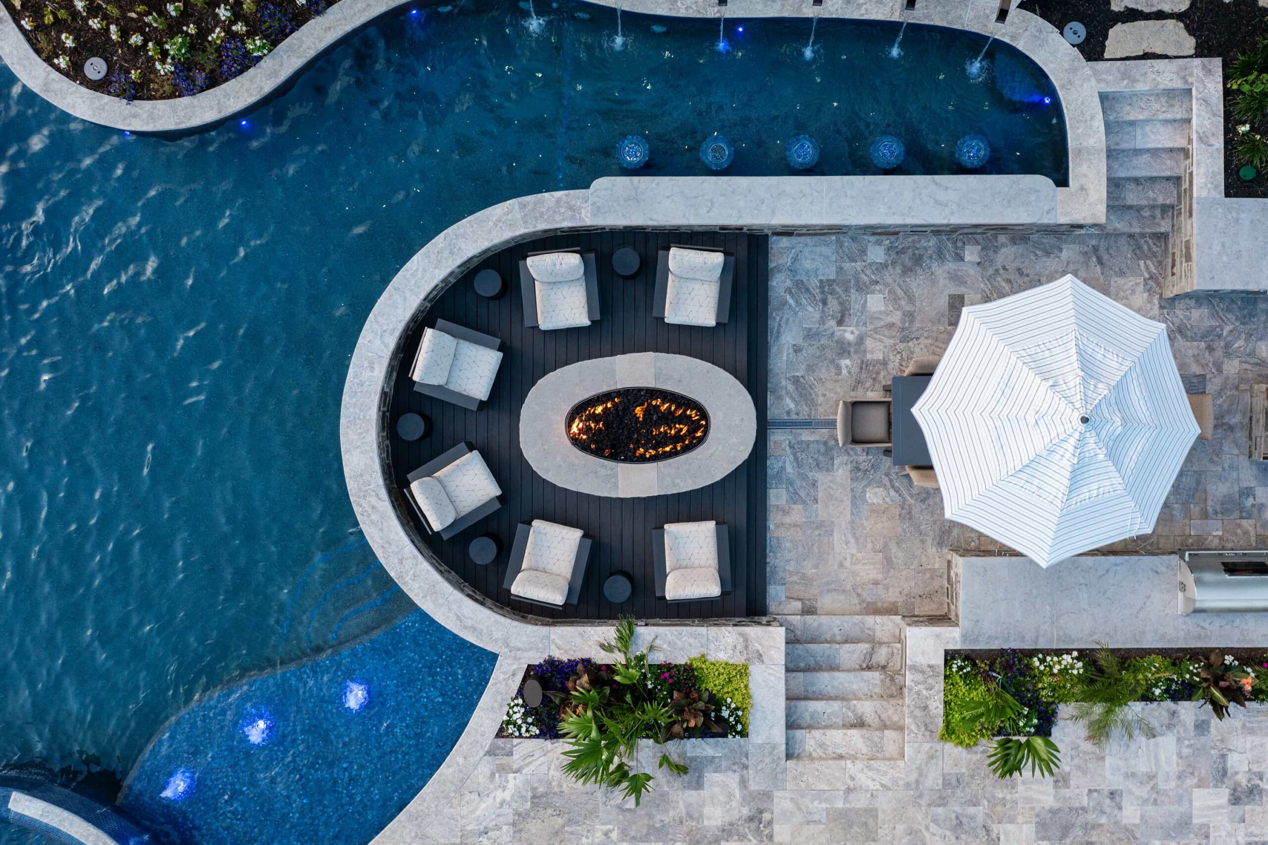 The freeform pool design weaves seamlessly through the expansive limestone terrace, connecting multiple zones of activity. An integrated circular spa offers a secluded place to unwind, while a sun shelf and sculptural in-water loungers provide resort-inspired comfort. A swim-up fire lounge set within the pool’s edge creates an unforgettable focal point — allowing guests to gather around flickering flames while partially immersed.