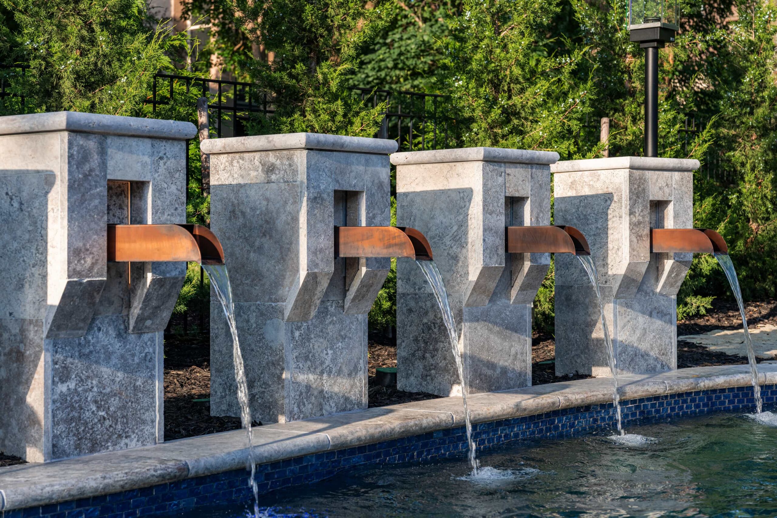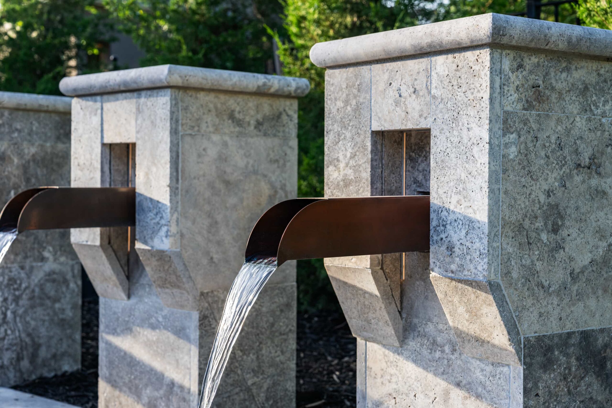 This backyard retreat was designed as a fully immersive entertainment environment — layered with water, fire, texture, and technology. Anchoring the far edge of the pool, a series of symmetrical stone piers feature custom copper scuppers that spill steady ribbons of water into a perimeter basin, creating both visual rhythm and a calming acoustic backdrop.