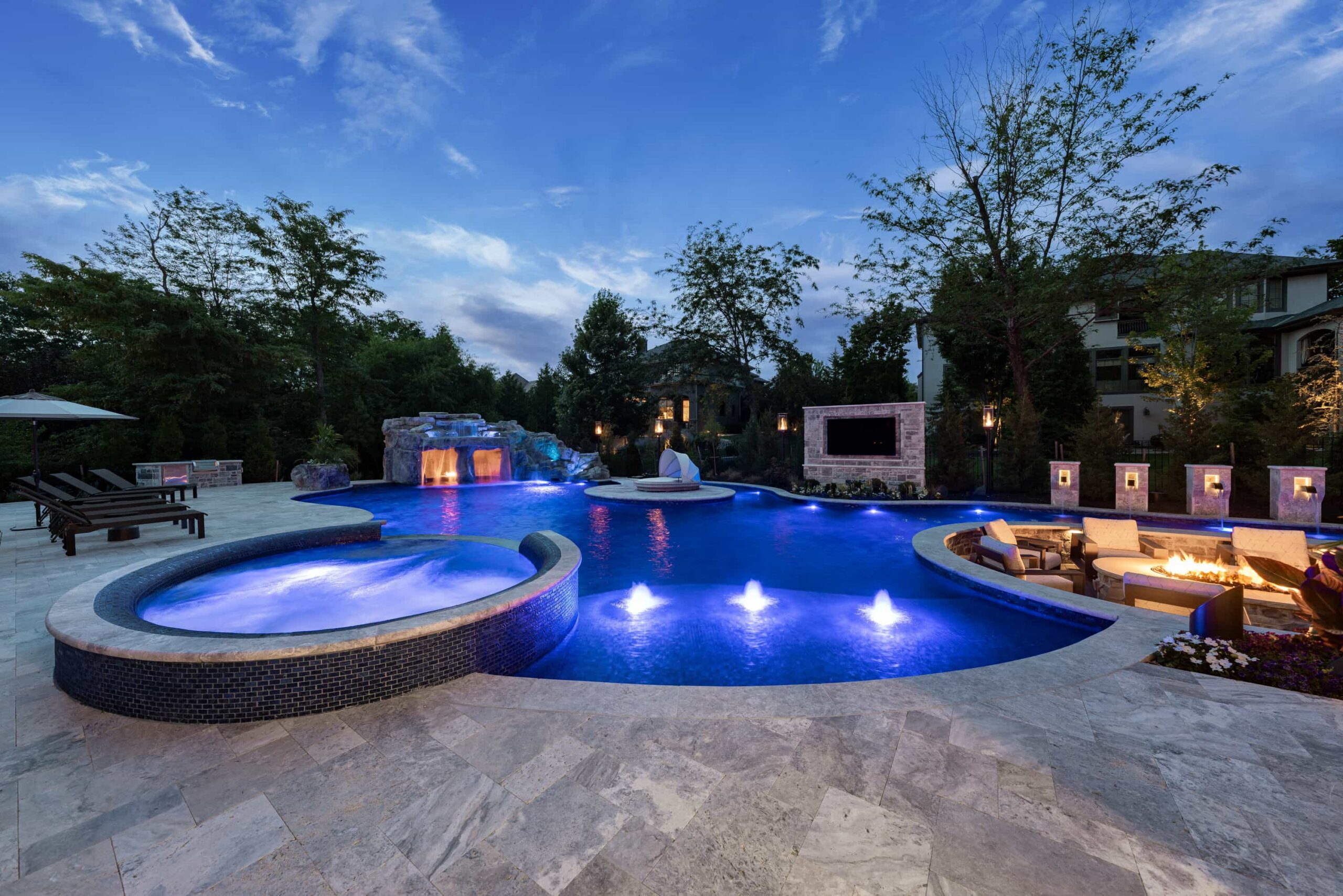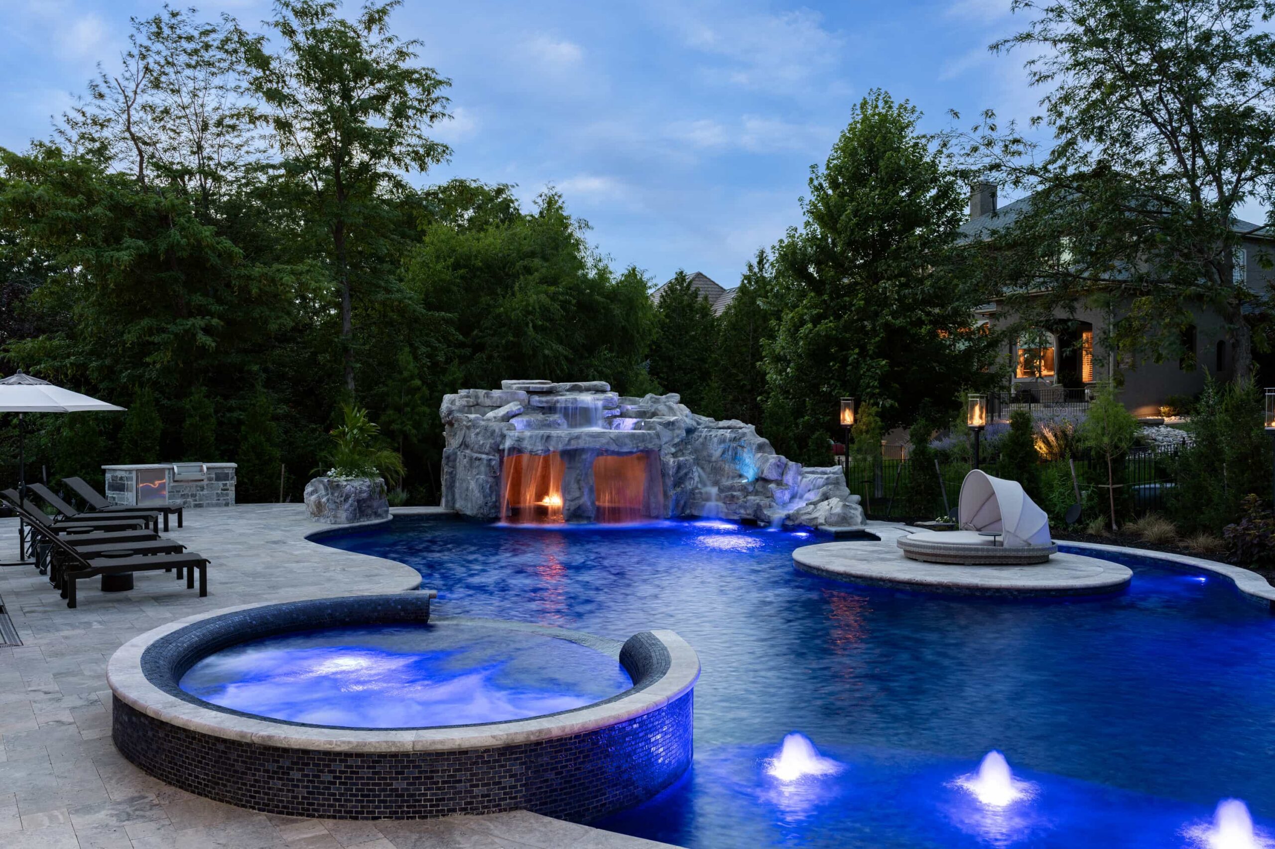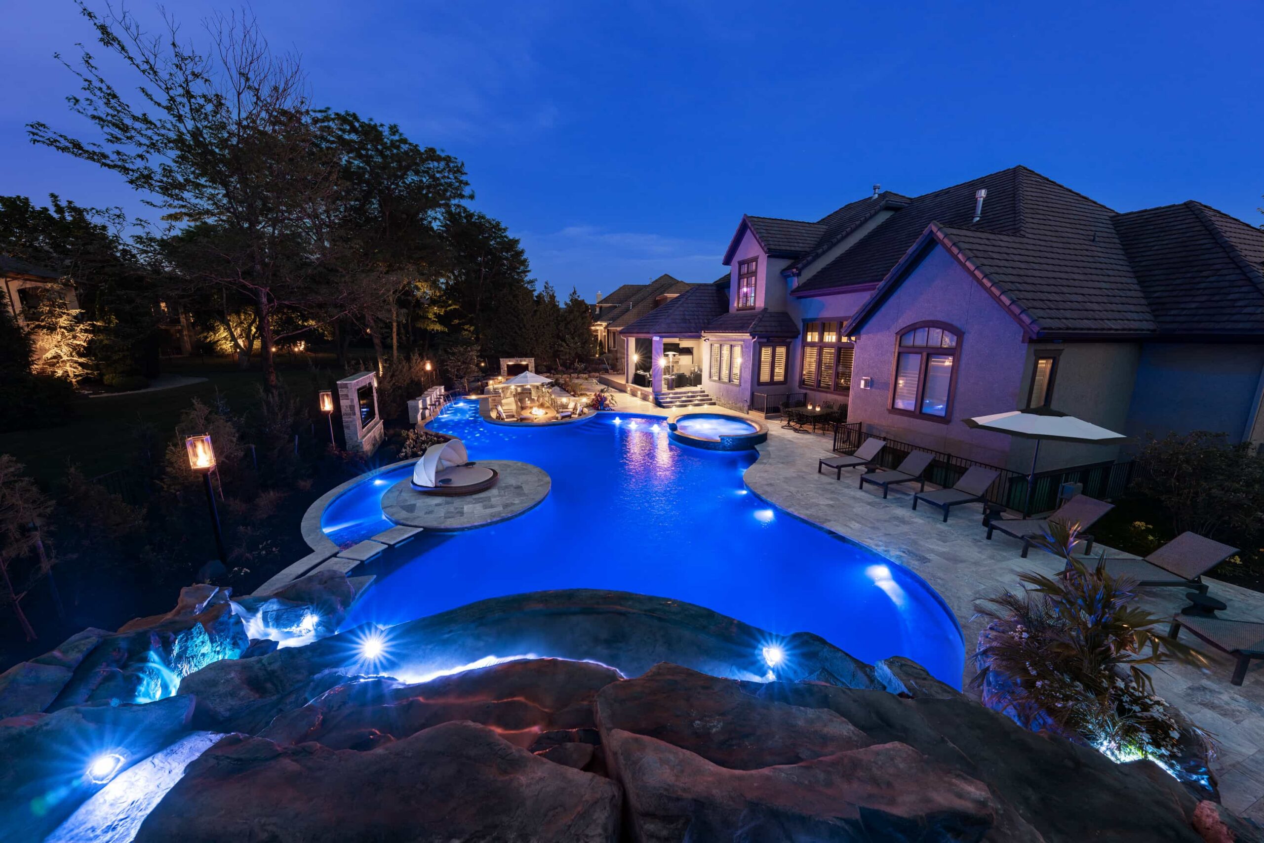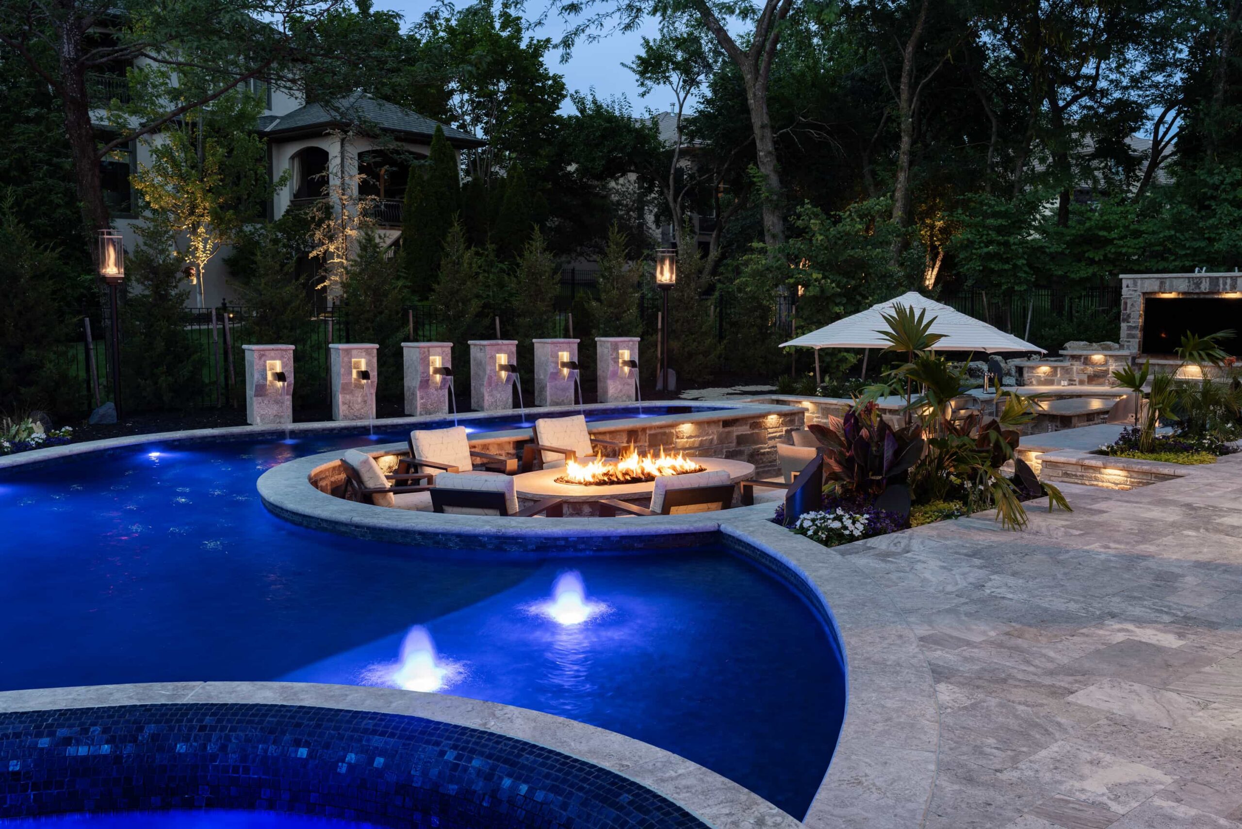 As evening falls, underwater lighting, fire features, and landscape illumination bring dimension and depth to every surface. The result is a sophisticated, multi-sensory outdoor living experience — designed for hosting, relaxing, and enjoying every season in style.