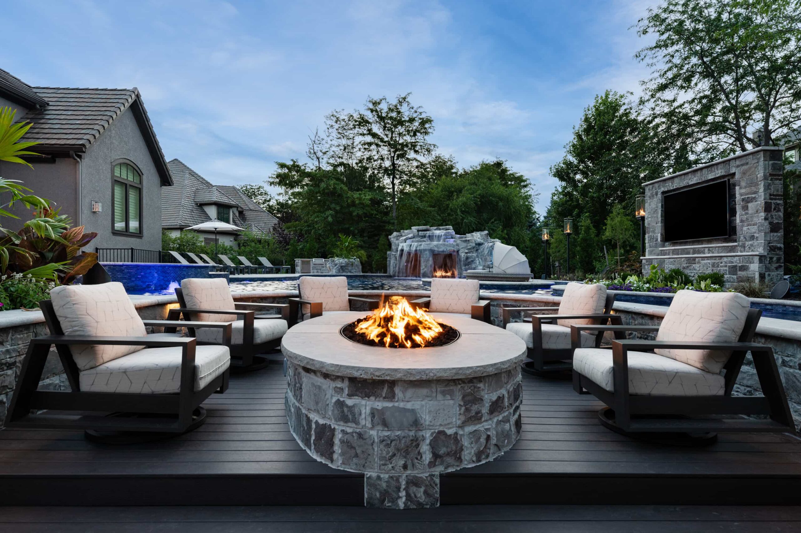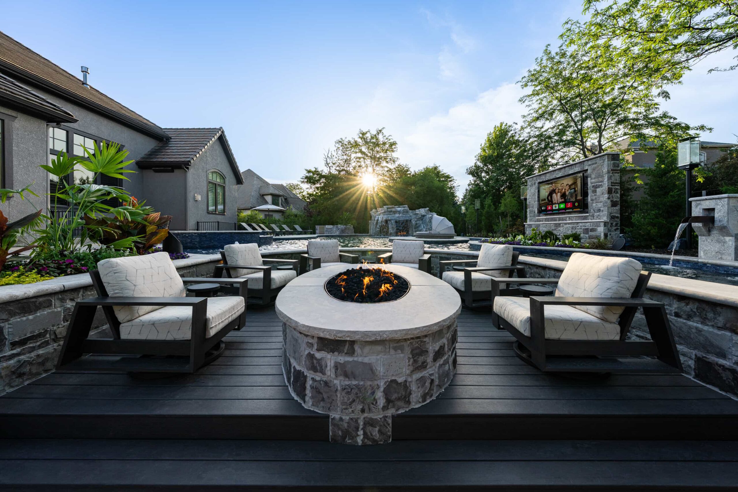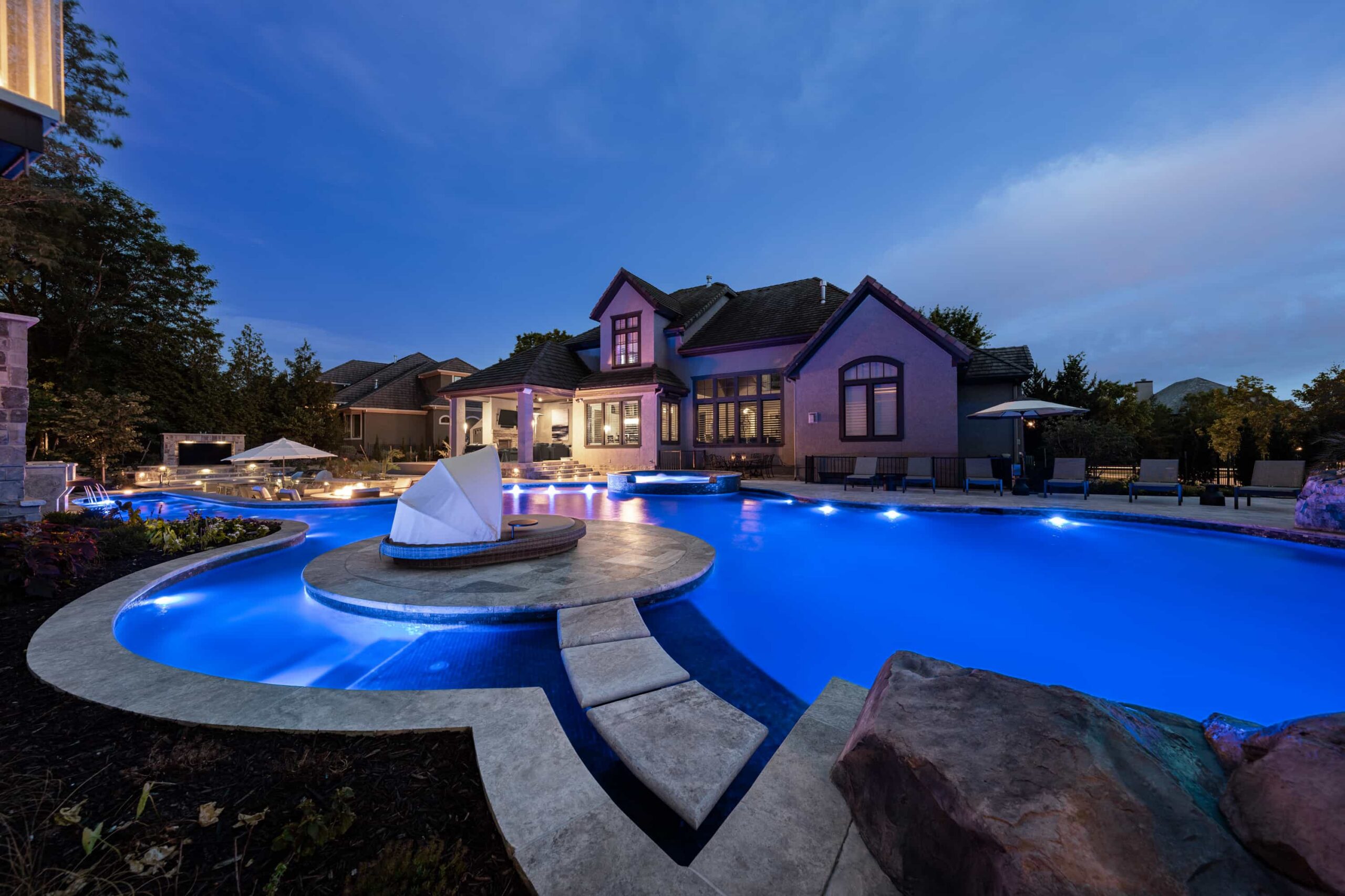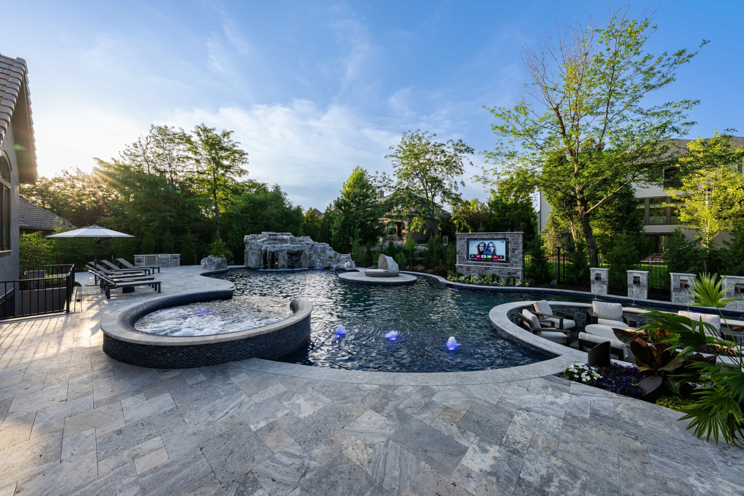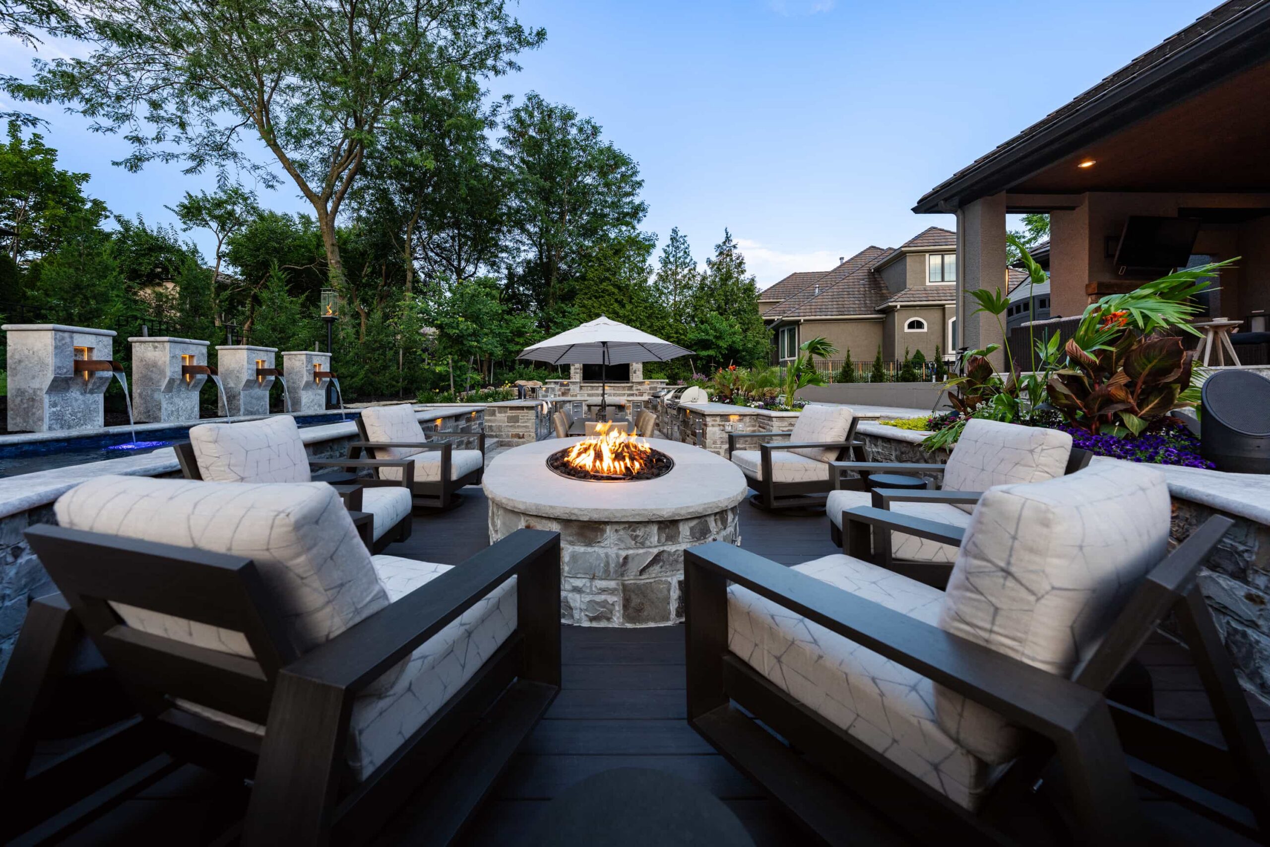 As evening falls, underwater lighting, fire features, and landscape illumination bring dimension and depth to every surface. The result is a sophisticated, multi-sensory outdoor living experience — designed for hosting, relaxing, and enjoying every season in style.